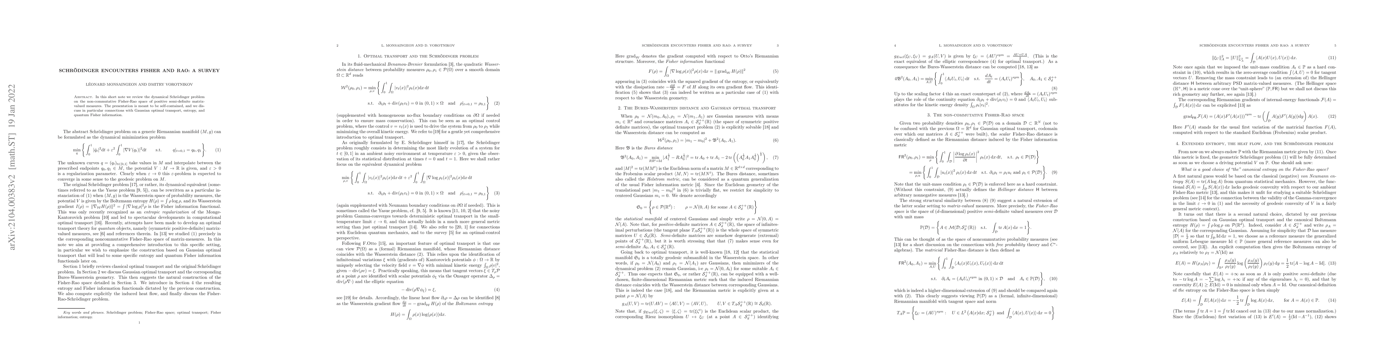 This paper surveys the Schrödinger dynamics on the non-commutative Fisher-Rao space of positive semi-definite matrix-valued measures, highlighting connections to Gaussian optimal transport, entropy, and quantum Fisher information. The review aims to be self-contained.