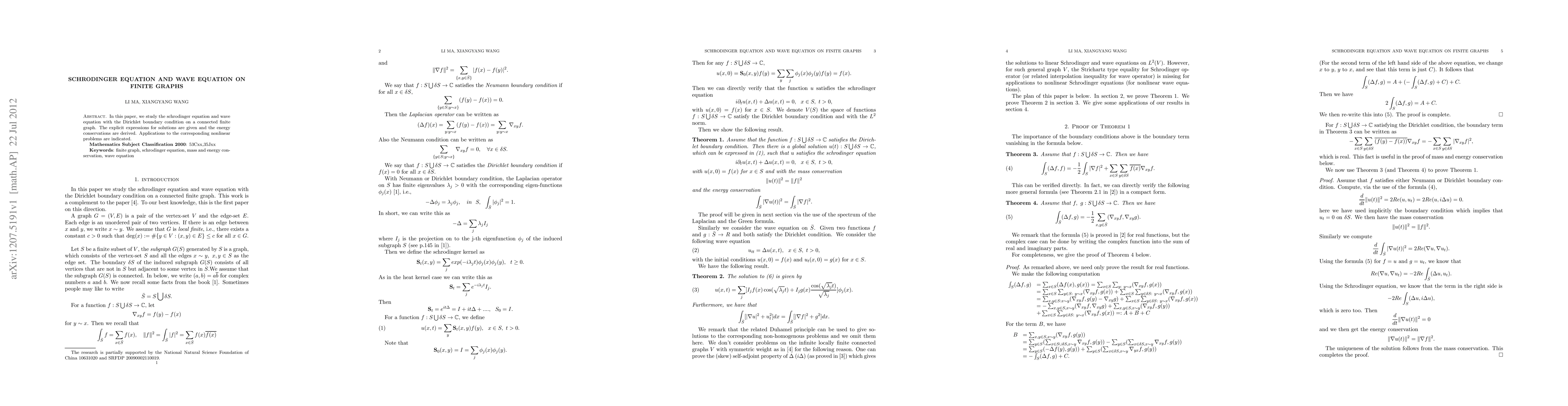 This paper investigates the Schrödinger and wave equations on finite graphs with Dirichlet boundary conditions, providing explicit solutions and deriving energy conservation laws. Applications to nonlinear problems are also discussed.