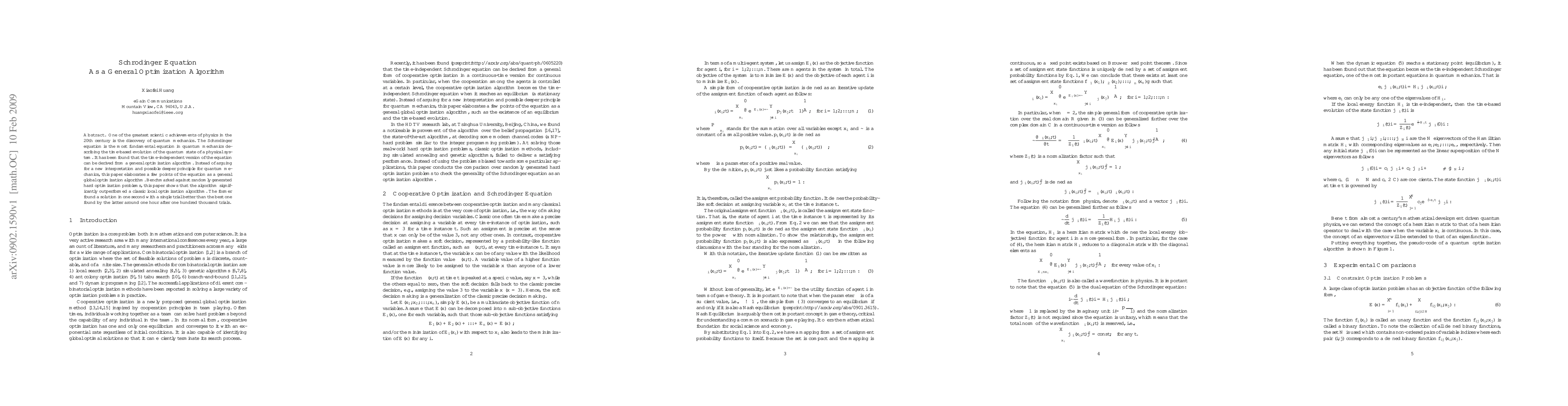 One of the greatest scientific achievements of physics in the 20th century is the discovery of quantum mechanics. The Schrodinger equation is the most fundamental equation in quantum mechanics describing the time-based evolution of the quantum state of a physical system. It has been found that the time-independent version of the equation can be derived from a general optimization algorithm. Instead of arguing for a new interpretation and possible deeper principle for quantum mechanics, this paper elaborates a few points of the equation as a general global optimization algorithm. Benchmarked against randomly generated hard optimization problems, this paper shows that the algorithm significantly outperformed a classic local optimization algorithm. The former found a solution in one second with a single trial better than the best one found by the latter around one hour after one hundred thousand trials.