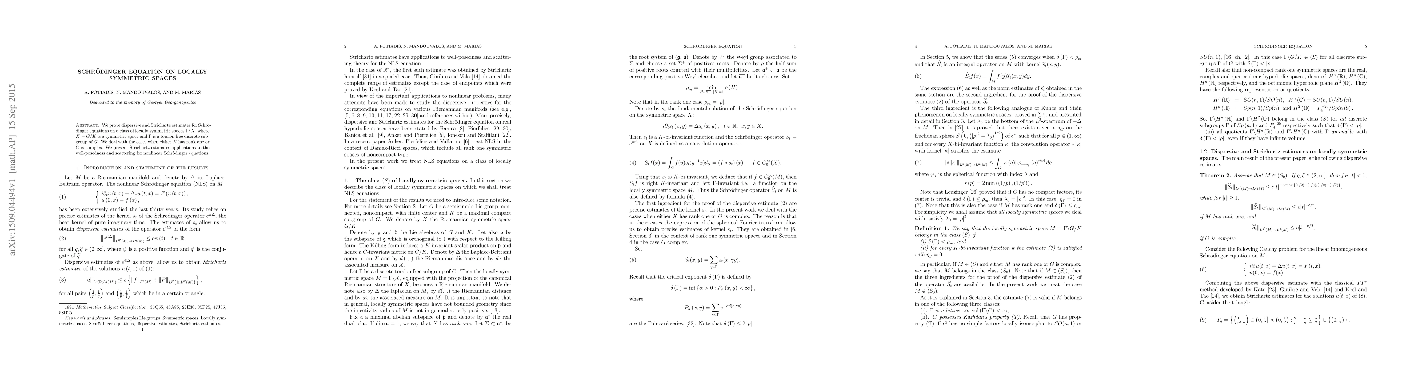This paper proves dispersive and Strichartz estimates for Schrödinger equations on locally symmetric spaces, focusing on cases with rank one spaces or complex groups. It applies these estimates to the well-posedness and scattering of nonlinear Schrödinger equations.