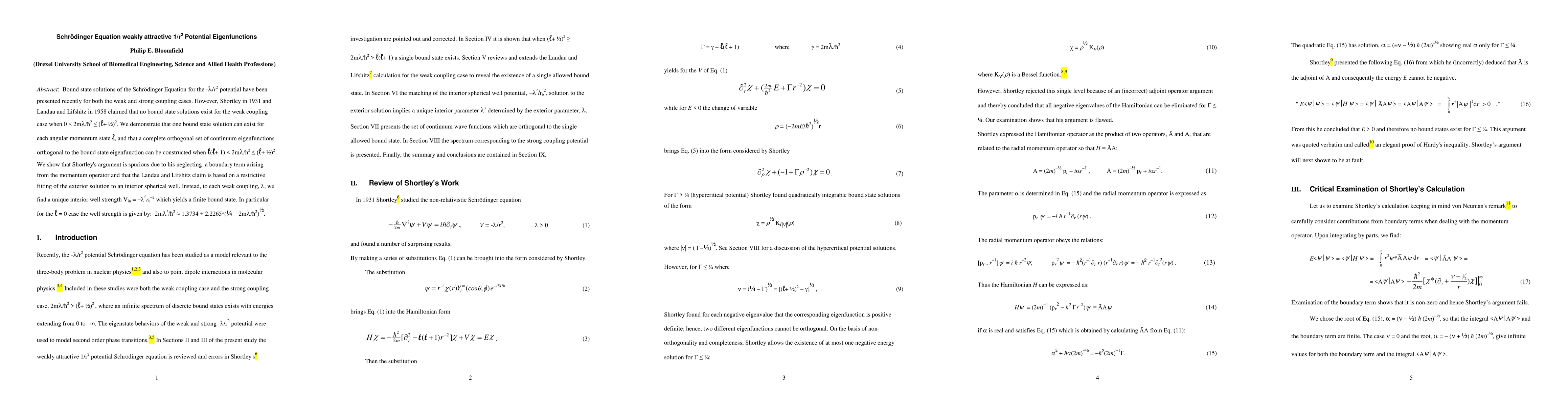 Bound state solutions of the Schrodinger Equation for the $-a/r^2$ potential have been presented recently for both the weak and strong coupling cases. However, Shortley in 1931 and Landau and Lifshitz in 1958 claimed that no bound state solutions exist for the weak coupling case when $0 < 2ma/\hbar^2 <= (l + 1/2)^2$. We demonstrate that one bound state solution can exist for each angular momentum state l, and that a complete orthogonal set of continuum eigenfunctions orthogonal to the bound state eigenfunction can be constructed when $l(l+ 1) < 2ma/\hbar^2 <= (l + 1/2)^2$. We show that Shortley's argument is spurious due to his neglecting a boundary term arising from the momentum operator and that the Landau and Lifshitz claim is based on a restrictive fitting of the exterior solution to an interior spherical well. Instead, to each weak coupling, a, we find a unique interior well strength $V_{in} = -a'/ro^2$ which yields a finite bound state. In particular for the l = 0 case the well strength is given by: $2ma'/\hbar^2 = 1.3734 + 2.2265*(1/4 - 2ma'/\hbar^2)^{1/2}$.