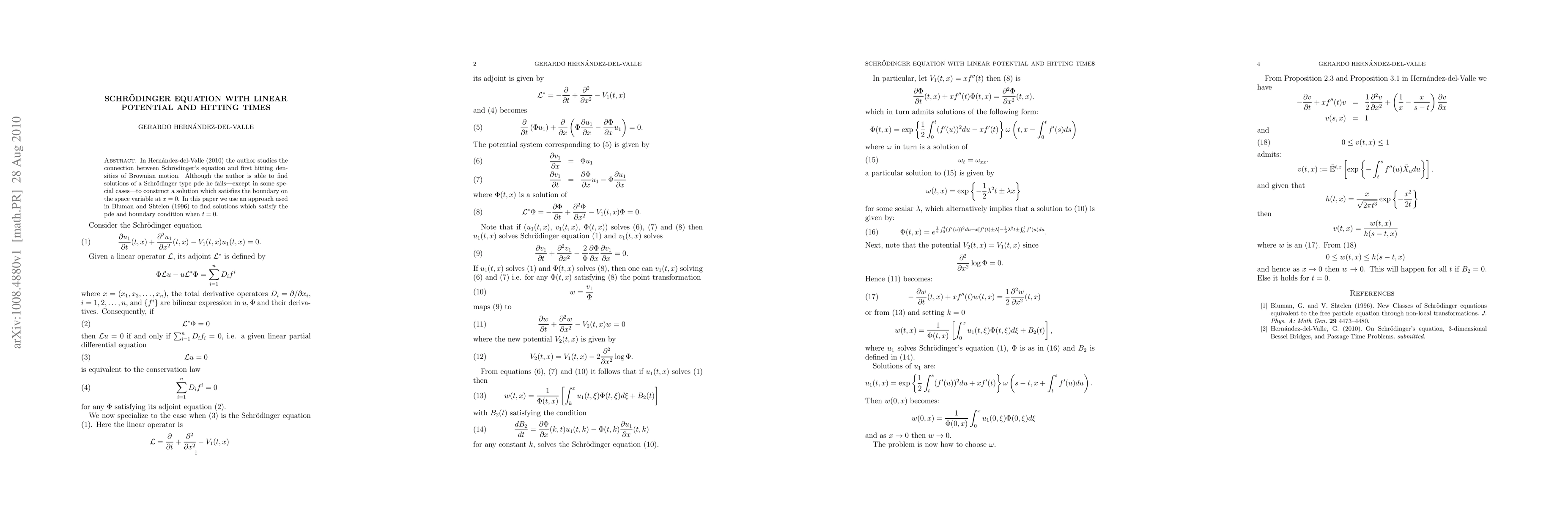 In Hern\'andez-del-Valle (2010) the author studies the connection between Schr\"odinger's equation and first hitting densities of Brownian motion. Although the author is able to find solutions of a Schr\"odinger type pde he fails---except in some special cases---to construct a solution which satisfies the boundary on the space variable at $x=0$. In this paper we use an approach used in Bluman and Shtelen (1996) to find solutions which satisfy the pde and boundary condition when $t=0$.