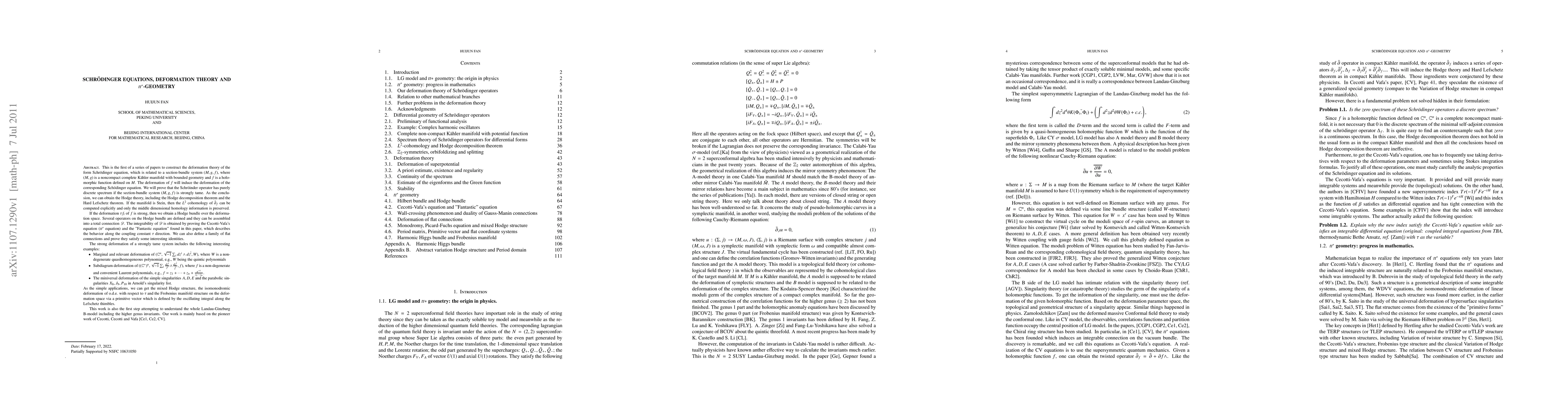 This is the first of a series of papers to construct the deformation theory of the form Schr\"odinger equation, which is related to a section-bundle system $(M,g,f)$, where $(M,g)$ is a noncompact complete K\"ahler manifold with bounded geometry and $f$ is a holomorphic function defined on $M$. This work is also the first step attempting to understand the whole Landau-Ginzburg B-model including the higher genus invariants. Our work is mainly based on the pioneer work of Cecotti, Cecotti and Vafa \cite{Ce1,Ce2,CV}.