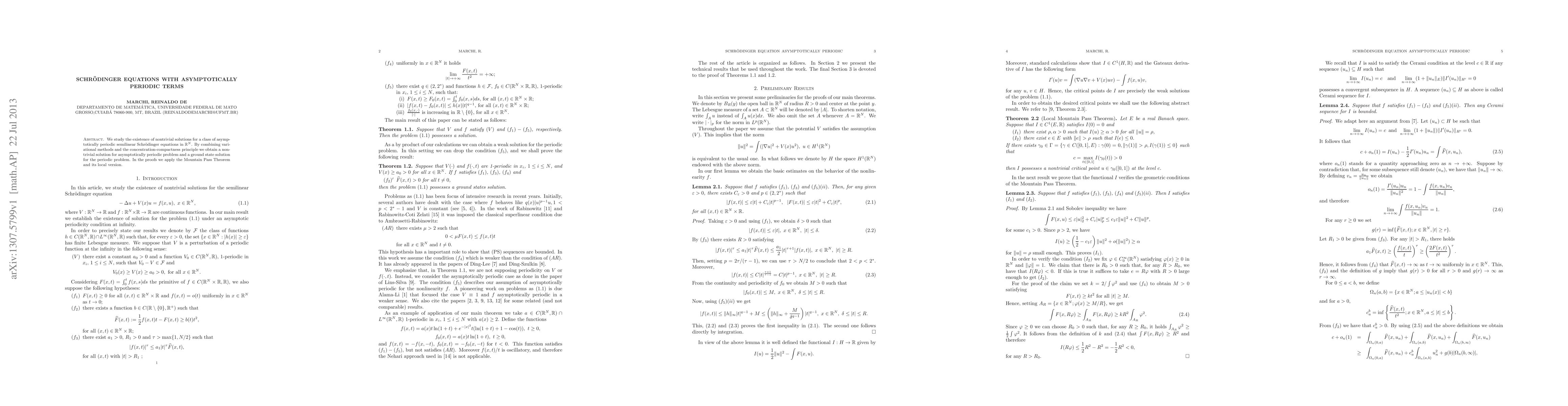 This paper investigates the existence of nontrivial solutions for asymptotically periodic semilinear Schrödinger equations in $\mathbb{R}^N$. Using variational methods and the concentration-compactness principle, it finds nontrivial solutions for the asymptotically periodic case and a ground state solution for the periodic case, employing the Mountain Pass Theorem and its local version.