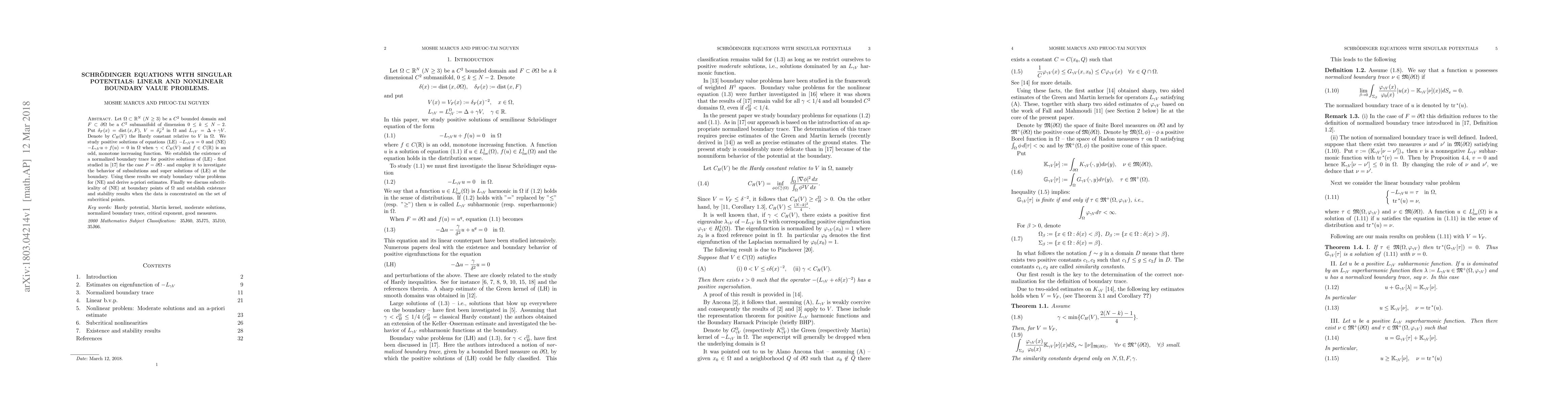 Let $\Omega \subset {\mathbb R}^N$ ($N \geq 3$) be a $C^2$ bounded domain and $F \subset \partial \Omega$ be a $C^2$ submanifold of dimension $0 \leq k \leq N-2$. Put $\delta_F(x)=dist(x,F)$, $V=\delta_F^{-2}$ in $\Omega$ and $L_{\gamma V}=\Delta + \gamma V$. Denote by $C_H(V)$ the Hardy constant relative to $V$ in $\Omega$. We study positive solutions of equations (LE) $-L_{\gamma V} u = 0$ and (NE) $-L_{\gamma V} u+ f(u) = 0$ in $\Omega$ when $\gamma < C_H(V)$ and $f \in C({\mathbb R})$ is an odd, monotone increasing function. We establish the existence of a normalized boundary trace for positive solutions of (LE) - first studied by Marcus and Nguyen for the case $F=\partial \Omega$ - and employ it to investigate the behavior of subsolutions and super solutions of (LE) at the boundary. Using these results we study boundary value problems for (NE) and derive a-priori estimates. Finally we discuss subcriticality of (NE) at boundary points of $\Omega$ and establish existence and stability results when the data is concentrated on the set of subcritical points.