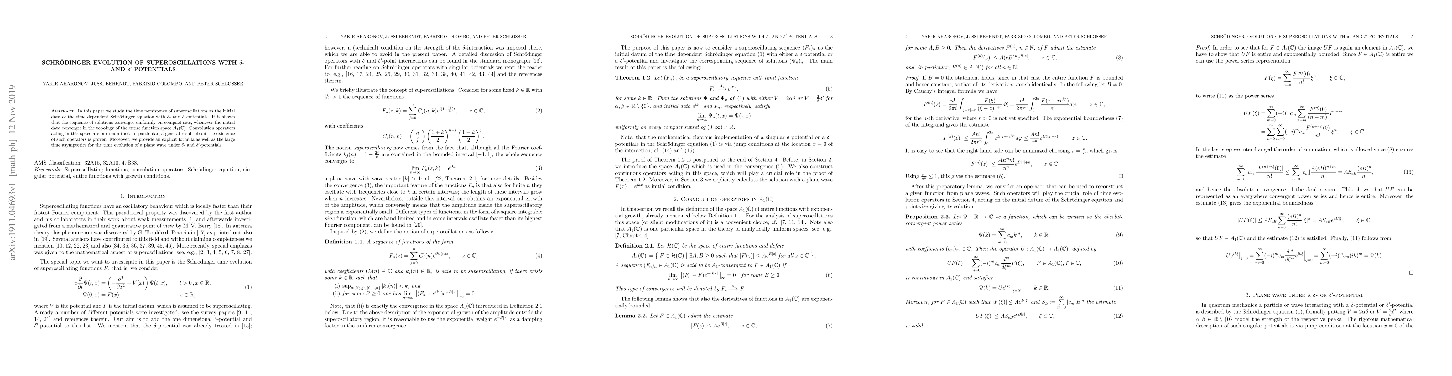 This paper investigates the persistence of superoscillations in the time-dependent Schrödinger equation with $\delta$- and $\delta'$-potentials, demonstrating uniform convergence of solution sequences under certain initial conditions. The study employs convolution operators in the entire function space $A_1(\mathbb{C})$, proving their existence and providing explicit formulas for the time evolution of plane waves under these potentials.