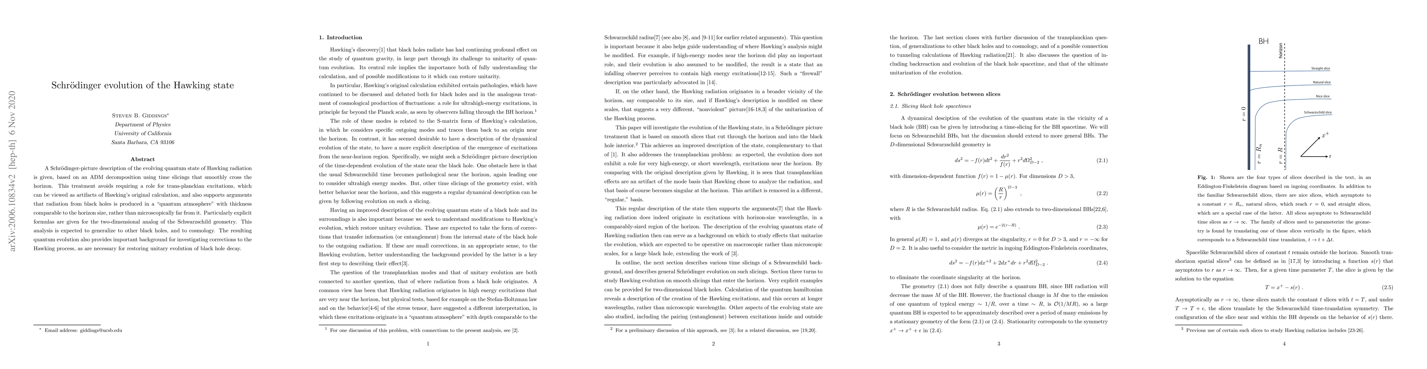 A Schr\"odinger-picture description of the evolving quantum state of Hawking radiation is given, based on an ADM decomposition using time slicings that smoothly cross the horizon. This treatment avoids requiring a role for trans-planckian modes, which can be viewed as artifacts of Hawking's original calculation, and also supports arguments that radiation from black holes is produced in a "quantum atmosphere" with thickness comparable to the horizon size, rather than microscopically far from it. Particularly explicit formulas are given for the two-dimensional analog of the Schwarzschild geometry. This analysis is expected to generalize to other black holes, and to cosmology. The resulting quantum evolution also provides important background for investigating corrections to the Hawking process, as are necessary for restoring unitary evolution of black hole decay.