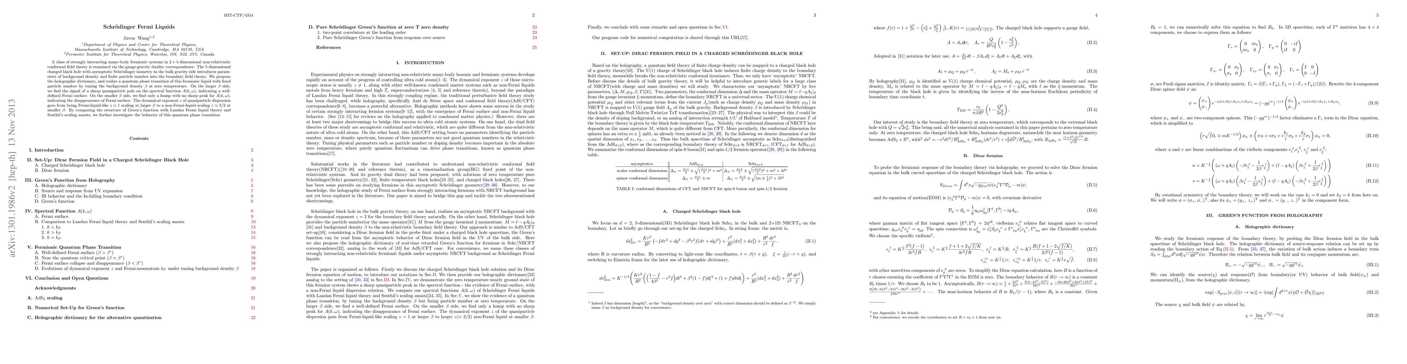 A class of strongly interacting many-body fermionic systems in 2+1D non-relativistic conformal field theory is examined via the gauge-gravity duality correspondence. The 5D charged black hole with asymptotic Schrodinger isometry in the bulk gravity side introduces parameters of background density and finite particle number into the boundary field theory. We propose the holographic dictionary, and realize a quantum phase transition of this fermionic liquid with fixed particle number by tuning the background density $\beta$ at zero temperature. On the larger $\beta$ side, we find the signal of a sharp quasiparticle pole on the spectral function A(k,w), indicating a well-defined Fermi surface. On the smaller $\beta$ side, we find only a hump with no sharp peak for A(k,w), indicating the disappearance of Fermi surface. The dynamical exponent $z$ of quasiparticle dispersion goes from being Fermi-liquid-like $z\simeq1$ scaling at larger $\beta$ to a non-Fermi-liquid scaling $z\simeq 3/2$ at smaller $\beta$. By comparing the structure of Green's function with Landau Fermi liquid theory and Senthil's scaling ansatz, we further investigate the behavior of this quantum phase transition.