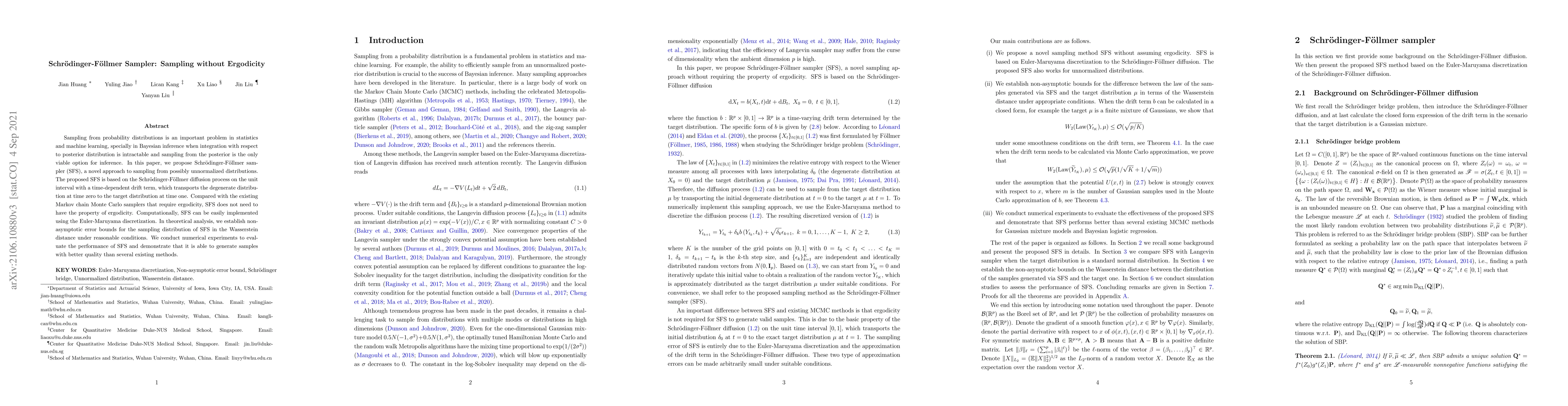 The Schrödinger-Foellmer Sampler (SFS) is a novel approach to sampling from unnormalized distributions without requiring ergodicity, offering improved performance over existing methods in numerical experiments.