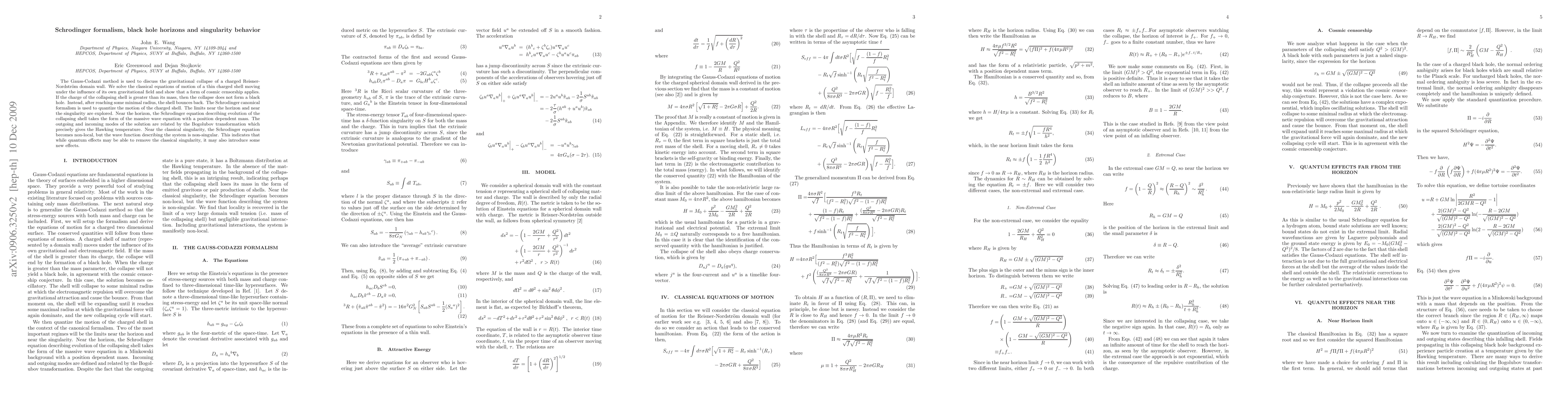 This research applies the Gauss-Codazzi method and Schrodinger formalism to analyze a charged Reisner-Nordstr"om domain wall's gravitational collapse. It shows that if a charged shell's mass is less than its charge, a black hole won't form; instead, the shell bounces back. Near a horizon, the Schrodinger equation resembles a massive wave equation with a position-dependent mass, and the Bogolubov transformation relates modes, yielding Hawking temperature. Near the singularity, the equation turns non-local, but the wave function remains singular-free, suggesting quantum effects might eliminate classical singularities, yet introduce new phenomena.