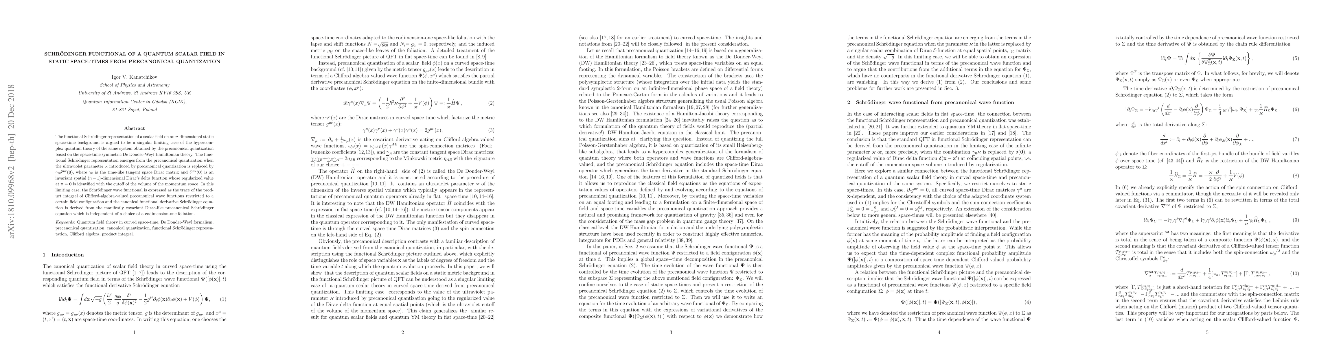 The functional Schr\"odinger representation of a scalar field on an $n$-dimensional static space-time background is argued to be a singular limiting case of the hypercomplex quantum theory of the same system obtained by the precanonical quantization based on the space-time symmetric De Donder-Weyl Hamiltonian theory. The functional Schr\"odinger representation emerges from the precanonical quantization when the ultraviolet parameter $\varkappa$ introduced by precanonical quantization is replaced by $\underline{\gamma}{}_0\delta^\mathrm{inv}(\mathbf{0})$, where $\underline{\gamma}{}_0$ is the time-like tangent space Dirac matrix and $\delta^\mathrm{inv}(\mathbf{0})$ is an invariant spatial $(n-1)$-dimensional Dirac's delta function whose regularized value at $\mathbf{x}=\mathbf{0}$ is identified with the cutoff of the volume of the momentum space. In this limiting case, the Schr\"odinger wave functional is expressed as the trace of the product integral of Clifford-algebra-valued precanonical wave functions restricted to a certain field configuration and the canonical functional derivative Schr\"odinger equation is derived from the manifestly covariant Dirac-like precanonical Schr\"odinger equation which is independent of a choice of a codimension-one foliation.