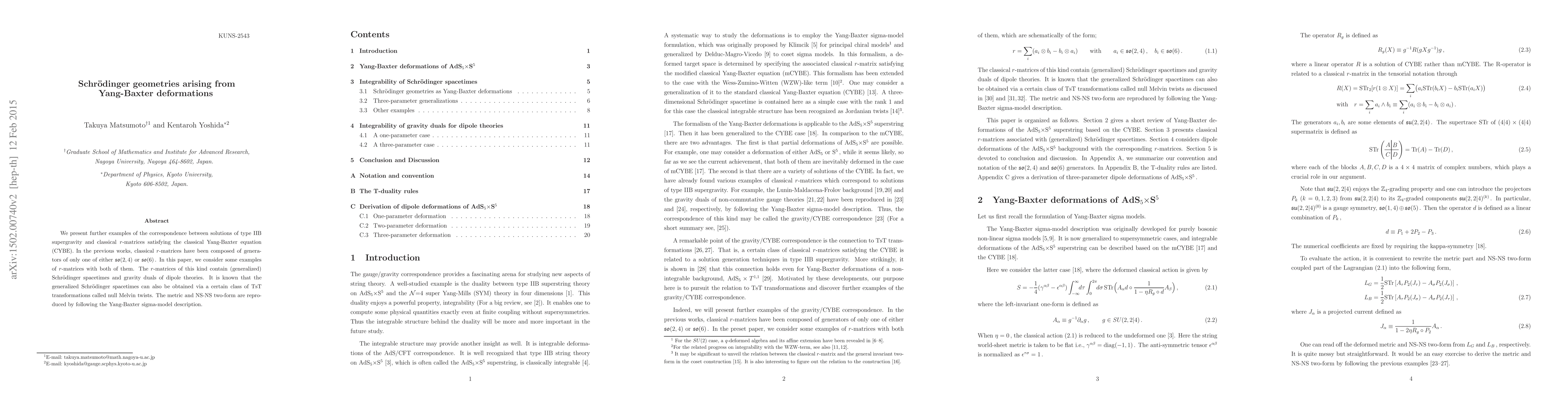 We present further examples of the correspondence between solutions of type IIB supergravity and classical $r$-matrices satisfying the classical Yang-Baxter equation (CYBE). In the previous works, classical $r$-matrices have been composed of generators of only one of either $\mathfrak{so}(2,4)$ or $\mathfrak{so}(6)$. In this paper, we consider some examples of $r$-matrices with both of them. The $r$-matrices of this kind contain (generalized) Schr\"odinger spacetimes and gravity duals of dipole theories. It is known that the generalized Schr\"odinger spacetimes can also be obtained via a certain class of TsT transformations called null Melvin twists. The metric and NS-NS two-form are reproduced by following the Yang-Baxter sigma-model description.