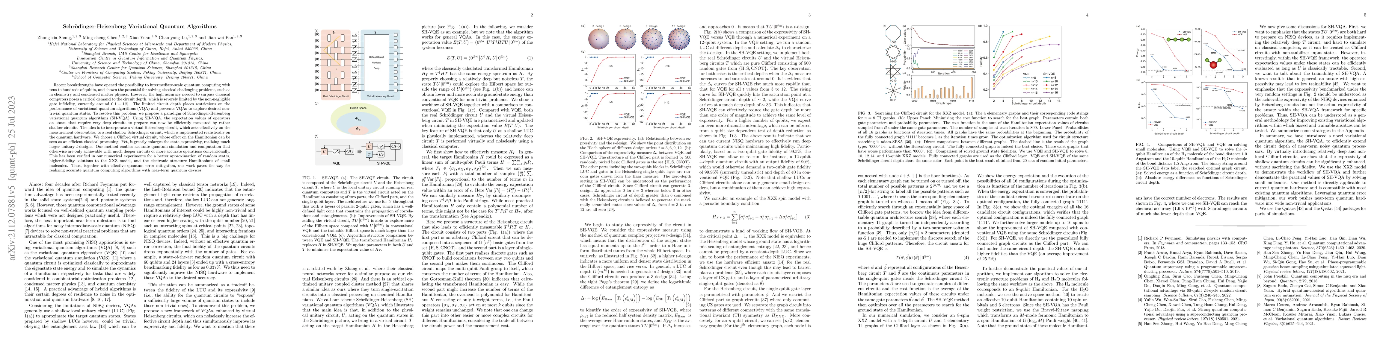 Recent breakthroughs have opened the possibility to intermediate-scale quantum computing with tens to hundreds of qubits, and shown the potential for solving classical challenging problems, such as in chemistry and condensed matter physics. However, the extremely high accuracy needed to surpass classical computers poses a critical demand to the circuit depth, which is severely limited by the non-negligible gate infidelity, currently around 0.1-1%. Here, by incorporating a virtual Heisenberg circuit, which acts effectively on the measurement observables, to a real shallow Schr\"odinger circuit, which is implemented realistically on the quantum hardware, we propose a paradigm of Schr\"odinger-Heisenberg variational quantum algorithms to resolve this problem. We choose a Clifford virtual circuit, whose effect on the Hamiltonian can be efficiently and classically implemented according to the Gottesman-Knill theorem. Yet, it greatly enlarges the state expressivity, realizing much larger unitary t-designs. Our method enables accurate quantum simulation and computation that otherwise is only achievable with much deeper and more accurate circuits conventionally. This has been verified in our numerical experiments for a better approximation of random states and a higher-fidelity solution to the ground state energy of the XXZ model. Together with effective quantum error mitigation, our work paves the way for realizing accurate quantum computing algorithms with near-term quantum devices.