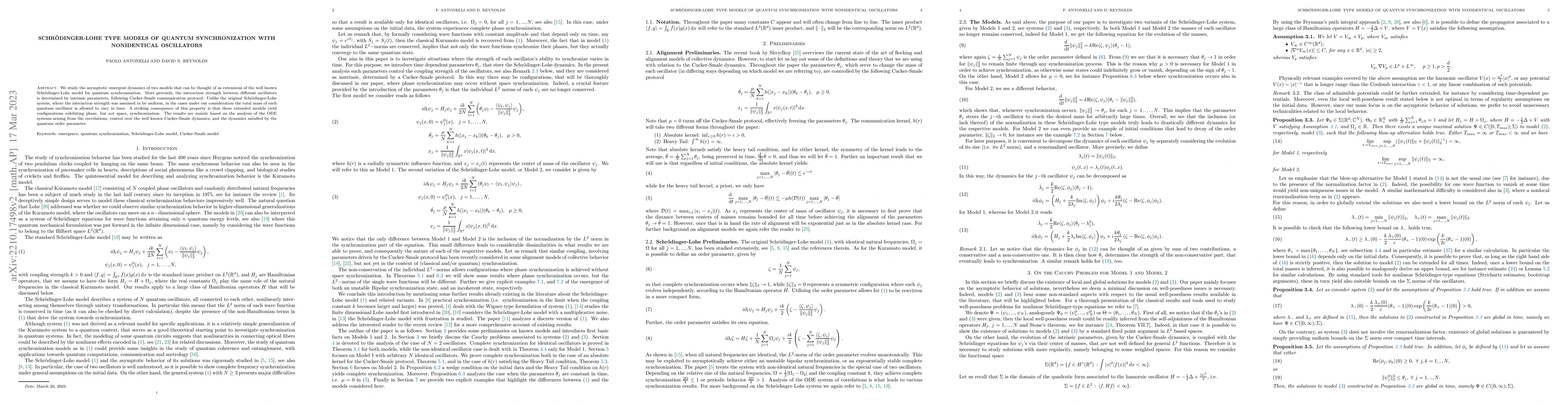 We study the asymptotic emergent dynamics of two models that can be thought of as extensions of the well known Schr\"odinger-Lohe model for quantum synchronization. More precisely, the interaction strength between different oscillators is determined by intrinsic parameters, following Cucker-Smale communication protocol. Unlike the original Schr\"odinger-Lohe system, where the interaction strength was assumed to be uniform, in the cases under our consideration the total mass of each quantum oscillator is allowed to vary in time. A striking consequence of this property is that these extended models yield configurations exhibiting phase, but not space, synchronization. The results are mainly based on the analysis of the ODE systems arising from the correlations, control over the well known Cucker-Smale dynamics, and the dynamics satisfied by the quantum order parameter.