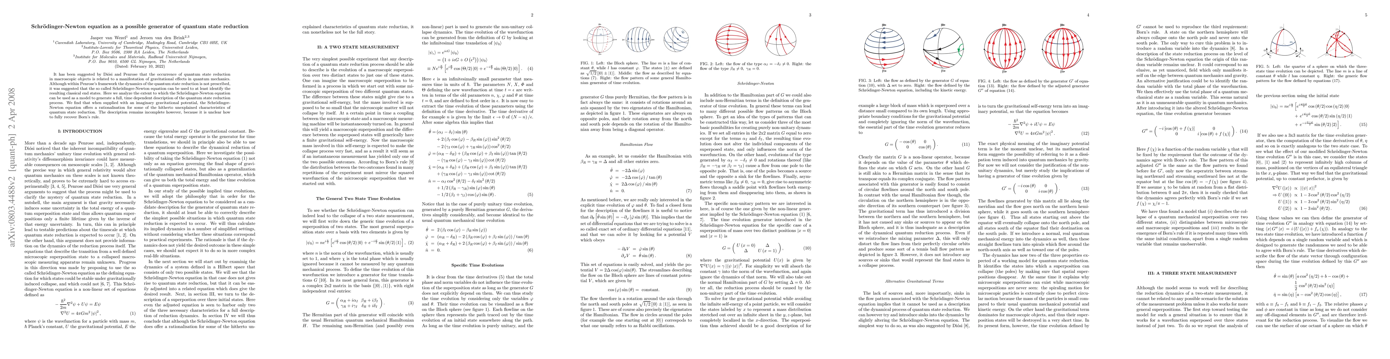 The paper explores the potential of the Schrodinger-Newton equation to model quantum state reduction, suggesting it rationalizes some unexplained features when an imaginary gravitational potential is applied. However, it remains incomplete due to the inability to fully recover Born's rule.