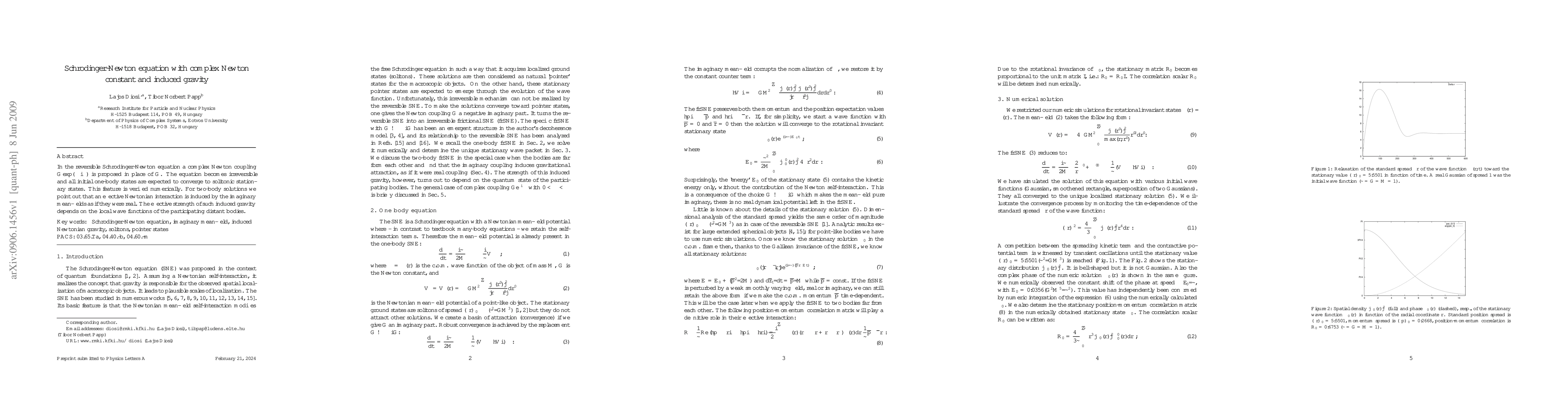 The paper proposes and numerically verifies the Schrodinger-Newton equation with a complex Newton constant, demonstrating its irreversibility and the emergence of solitonic states, along with induced gravity in two-body systems.