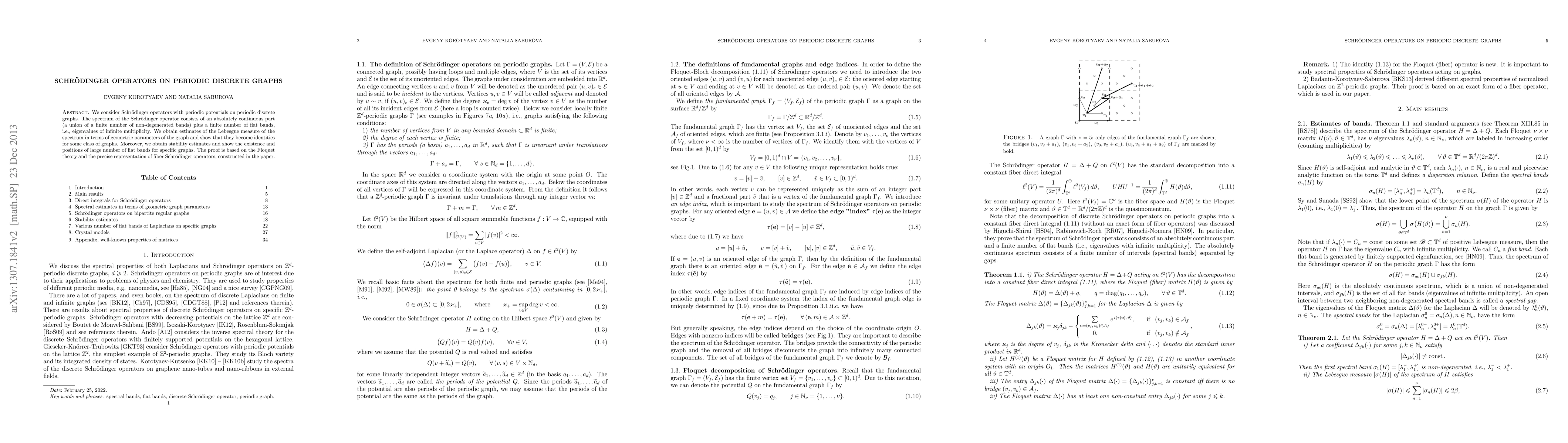 This paper studies Schrödinger operators with periodic potentials on periodic discrete graphs, finding that their spectrum comprises continuous bands and flat bands. It provides estimates for the Lebesgue measure of the spectrum in terms of graph geometry and proves the existence of numerous flat bands for specific graphs, employing Floquet theory and a new representation of fiber Schrödinger operators.