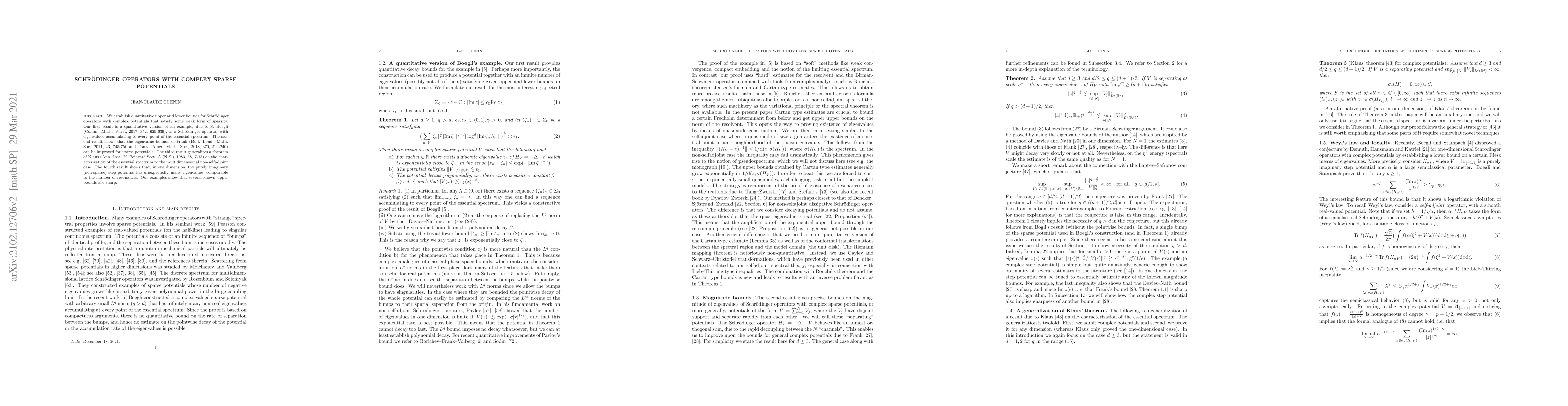 This paper provides quantitative bounds for Schrödinger operators with sparse complex potentials, improving upon previous results and characterizing the essential spectrum in multidimensional non-selfadjoint cases. It also highlights that purely imaginary step potentials in one dimension exhibit unexpectedly high eigenvalues, comparable to resonance counts.