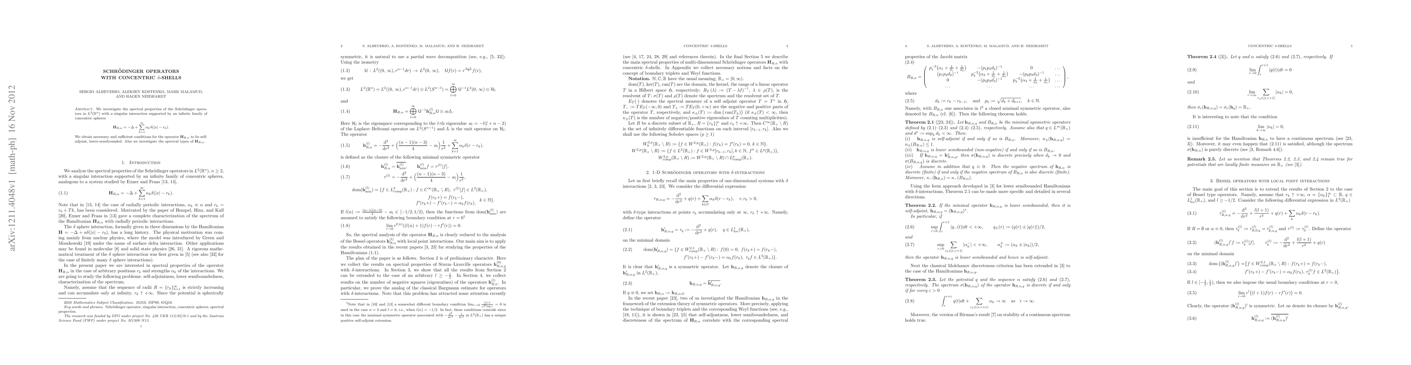 We investigate the spectral properties of the Schr\"odinger operators in $L^2(\mathbb{R}^n)$ with a singular interaction supported by an infinite family of concentric spheres $$ \mathbf{H}_{R,\alpha}=-\Delta+\sum_{k=1}^\infty\alpha_k\delta(|x|-r_k). $$ We obtain necessary and sufficient conditions for the operator $\mathbf{H}_{R,\alpha}$ to be self-adjoint, lower-semibounded. Also we investigate the spectral types of $\mathbf{H}_{R,\alpha}$.
