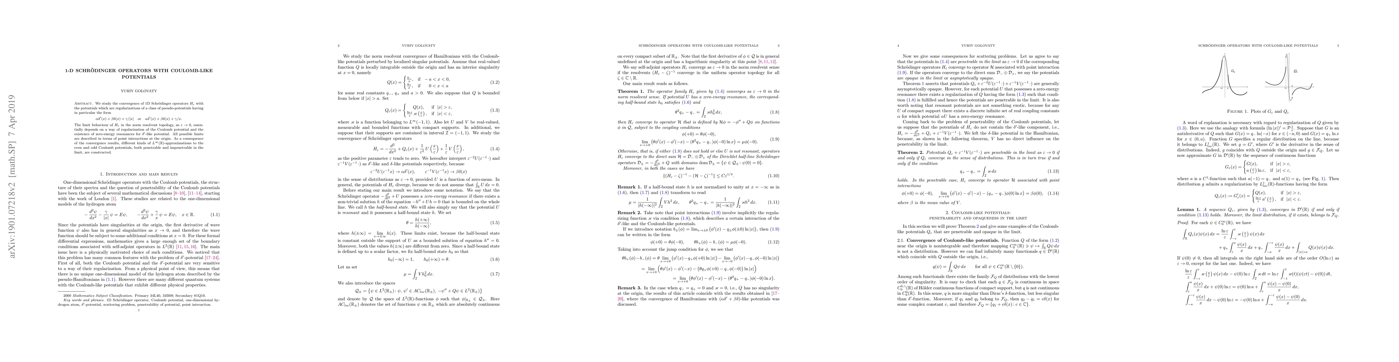 The study investigates the convergence of 1D Schrödinger operators with potentials regularizing pseudo-potentials, including forms with Coulomb-like behavior, in the norm resolvent topology as ε approaches zero.