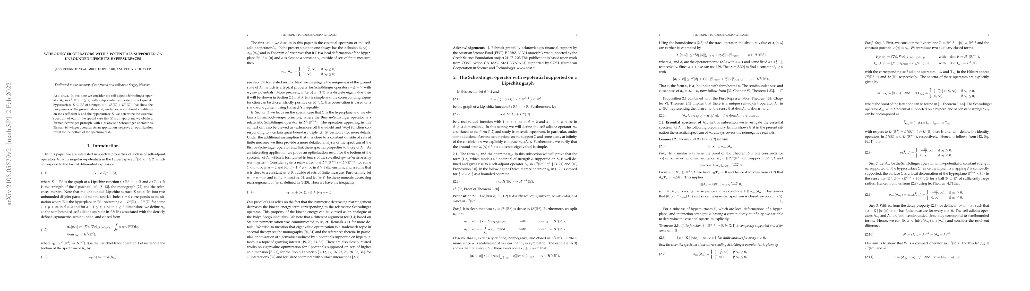 In this note we consider the self-adjoint Schr\"odinger operator $\mathsf{A}_\alpha$ in $L^2(\mathbb{R}^d)$, $d\geq 2$, with a $\delta$-potential supported on a Lipschitz hypersurface $\Sigma\subseteq\mathbb{R}^d$ of strength $\alpha\in L^p(\Sigma)+L^\infty(\Sigma)$. We show the uniqueness of the ground state and, under some additional conditions on the coefficient $\alpha$ and the hypersurface $\Sigma$, we determine the essential spectrum of $\mathsf{A}_\alpha$. In the special case that $\Sigma$ is a hyperplane we obtain a Birman-Schwinger principle with a relativistic Schr\"{o}dinger operator as Birman-Schwinger operator. As an application we prove an optimization result for the bottom of the spectrum of $\mathsf{A}_\alpha$.
