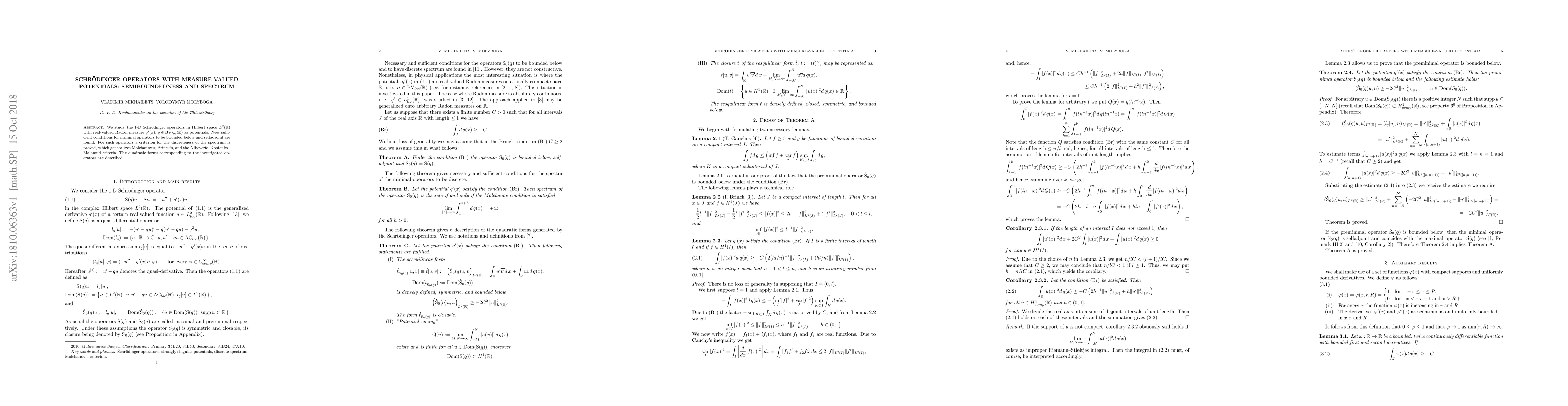 We study the 1-D Schr\"odinger operators in Hilbert space $L^{2}(\mathbb{R})$ with real-valued Radon measure $q'(x)$, $q\in \mathrm{BV}_{loc}(\mathbb{R})$ as potentials. New sufficient conditions for minimal operators to be bounded below and selfadjoint are found. For such operators a criterion for the discreteness of the spectrum is proved, which generalizes Molchanov's, Brinck's, and the Albeverio-Kostenko-Malamud criteria. The quadratic forms corresponding to the investigated operators are described.