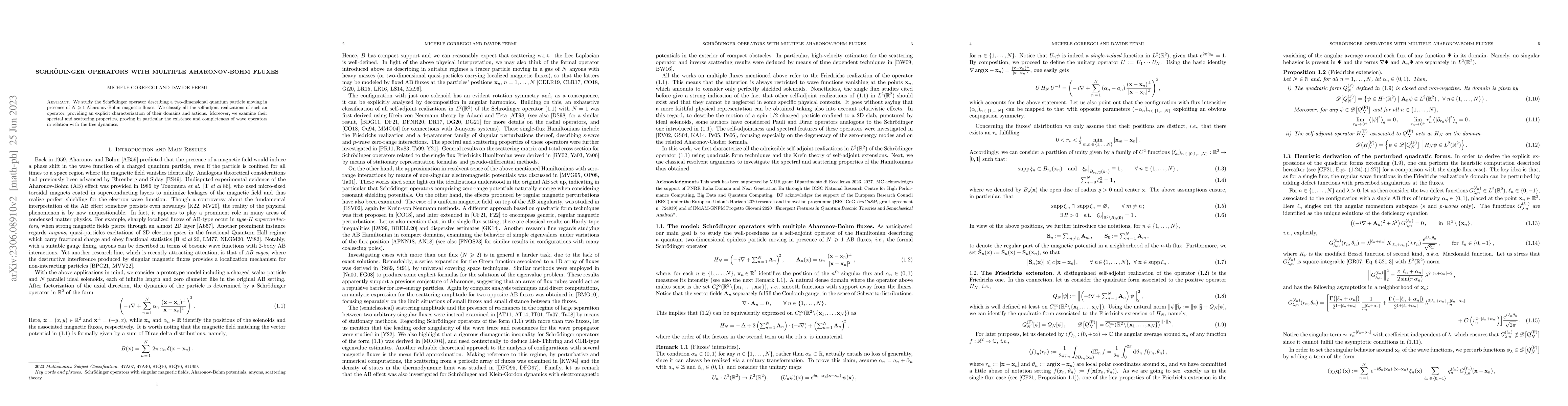 This paper classifies self-adjoint Schrödinger operators for a quantum particle in a two-dimensional plane with multiple Aharonov-Bohm magnetic fluxes, detailing their domains and actions. It also investigates their spectral and scattering properties, proving the existence and completeness of wave operators linked to free dynamics.