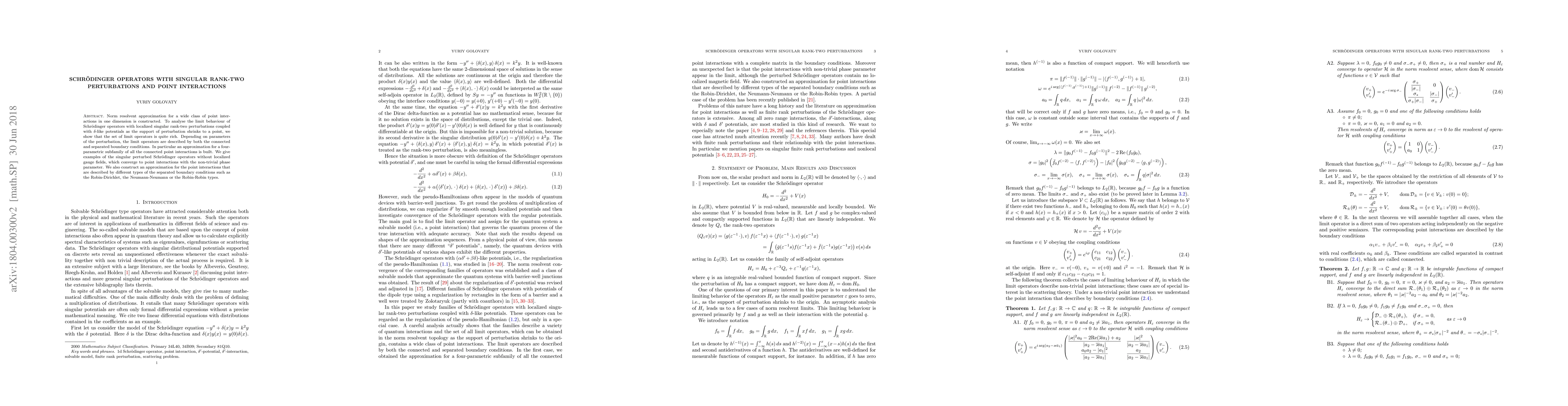 Norm resolvent approximation for a wide class of point interactions in one dimension is constructed. To analyse the limit behaviour of Schr\"odinger operators with localized singular rank-two perturbations coupled with {\delta}-like potentials as the support of perturbation shrinks to a point, we show that the set of limit operators is quite rich. Depending on parameters of the perturbation, the limit operators are described by both the connected and separated boundary conditions. In particular an approximation for a four-parametric subfamily of all the connected point interactions is built. We give examples of the singular perturbed Schr\"odinger operators without localized gauge fields, which converge to point interactions with the non-trivial phase parameter. We also construct an approximation for the point interactions that are described by different types of the separated boundary conditions such as the Robin-Dirichlet, the Neumann-Neumann or the Robin-Robin types.