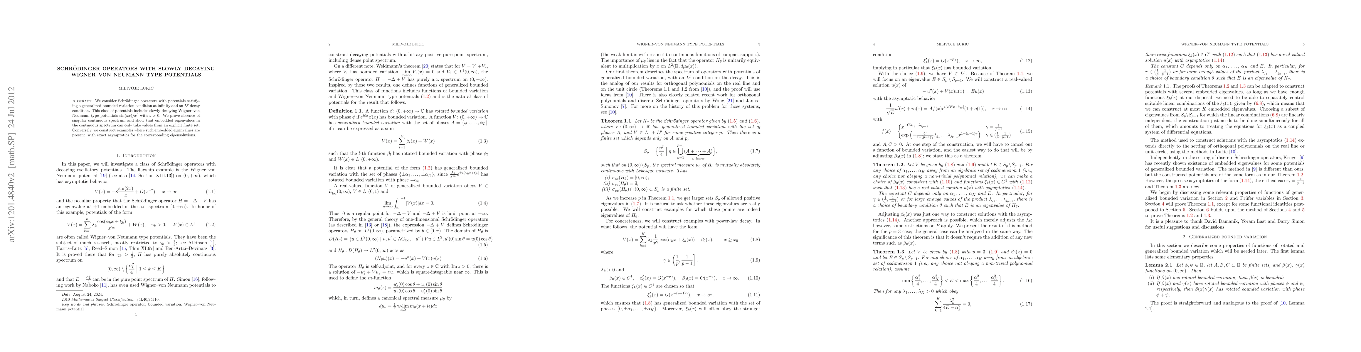 This paper investigates Schrödinger operators with slowly decaying potentials, specifically those resembling Wigner-von Neumann types, proving the absence of singular continuous spectrum and identifying the finite set of possible embedded eigenvalues. It also provides examples demonstrating the presence of such eigenvalues with precise asymptotic behavior for the eigenfunctions.
