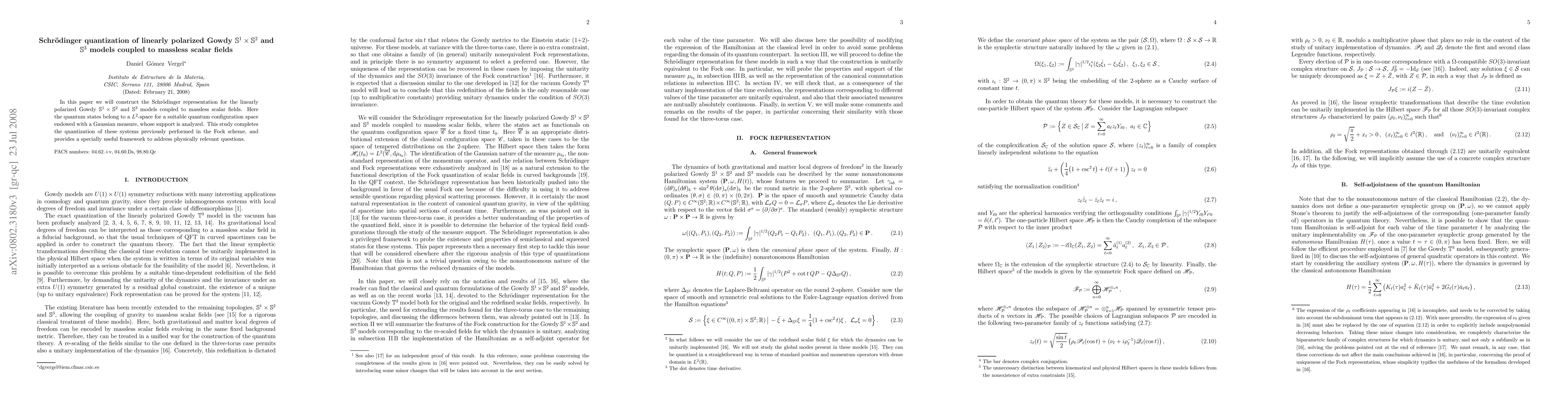 In this paper we will construct the Schrodinger representation for the linearly polarized Gowdy $S^1\times S^2$ and $S^3$ models coupled to massless scalar fields. Here the quantum states belong to a $L^2$-space for a suitable quantum configuration space endowed with a Gaussian measure, whose support is analyzed. This study completes the quantization of these systems previously performed in the Fock scheme, and provides a specially useful framework to address physically relevant questions.