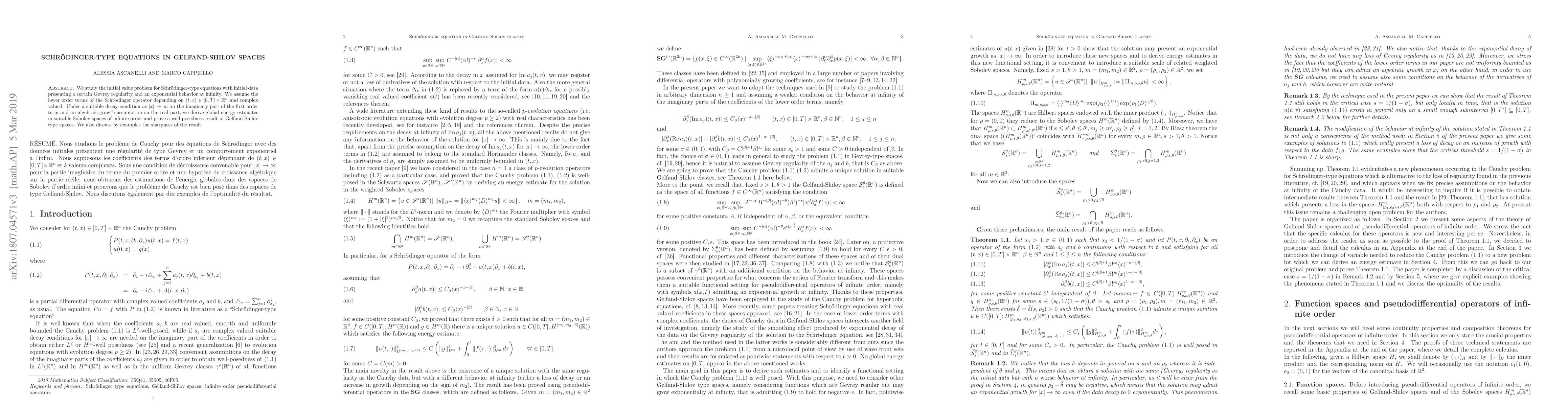 This paper investigates the initial value problem for Schrödinger-type equations with initial data exhibiting Gevrey regularity and exponential decay. It establishes global energy estimates and proves well-posedness in Gelfand-Shilov spaces under specific decay and growth conditions on the operator's terms.