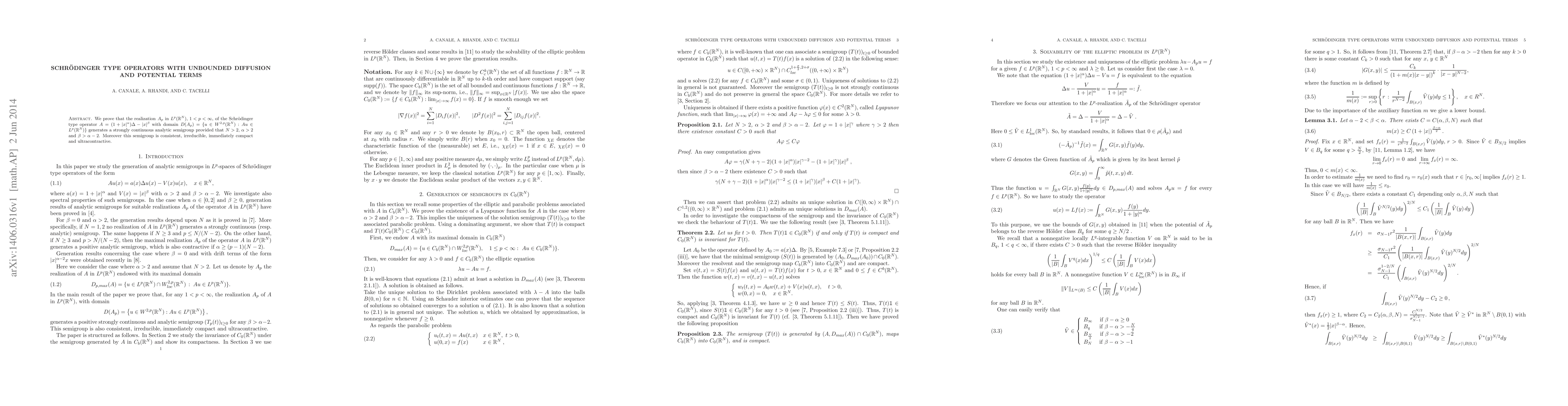 This research proves that under specific conditions (N>2, u03c3 >2, u03c3' > u03c3 -2) for certain Schru00f6dinger-type operators with unbounded diffusion and potential terms, a strongly continuous analytic semigroup is generated. This semigroup exhibits properties like consistency, irreducibility, immediate compactness, and ultracontractivity.