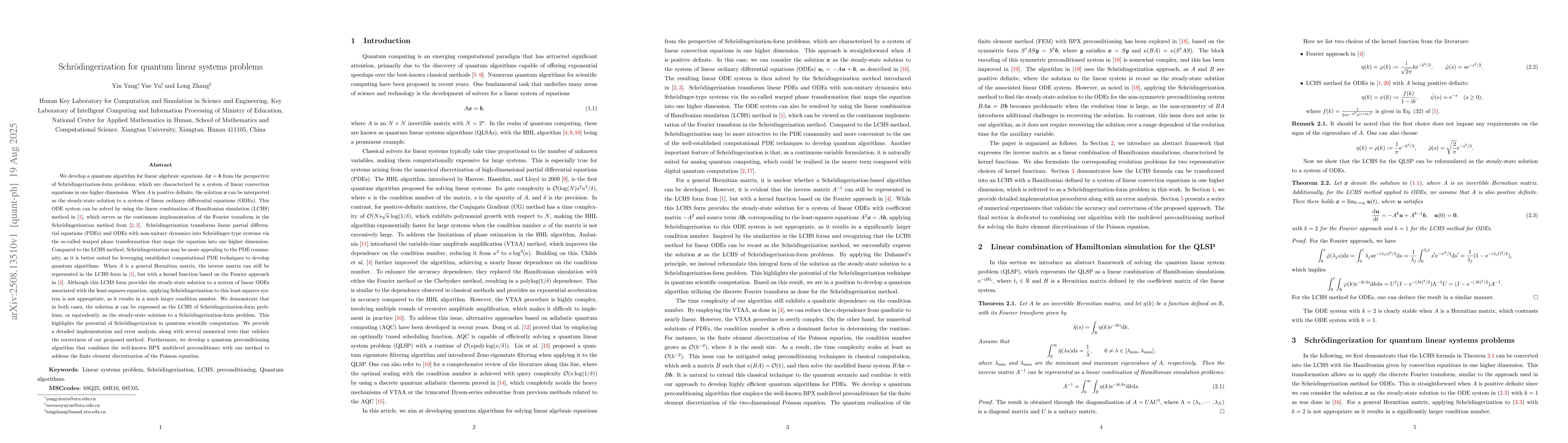 The paper introduces a Schrödingerization-based quantum algorithm for linear systems, a quantum preconditioning method, and demonstrates their effectiveness through numerical tests.