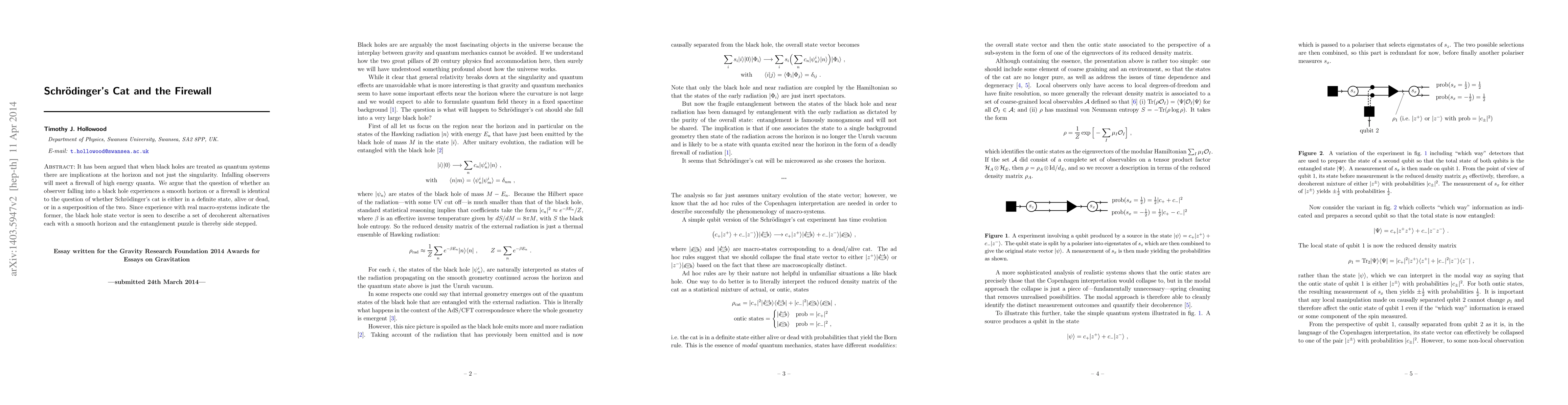 This paper explores the analogy between the firewall paradox in black hole physics and Schrodinger's cat thought experiment, concluding that the black hole state vector describes a set of decoherent alternatives, each with a smooth horizon, thus avoiding the entanglement puzzle.