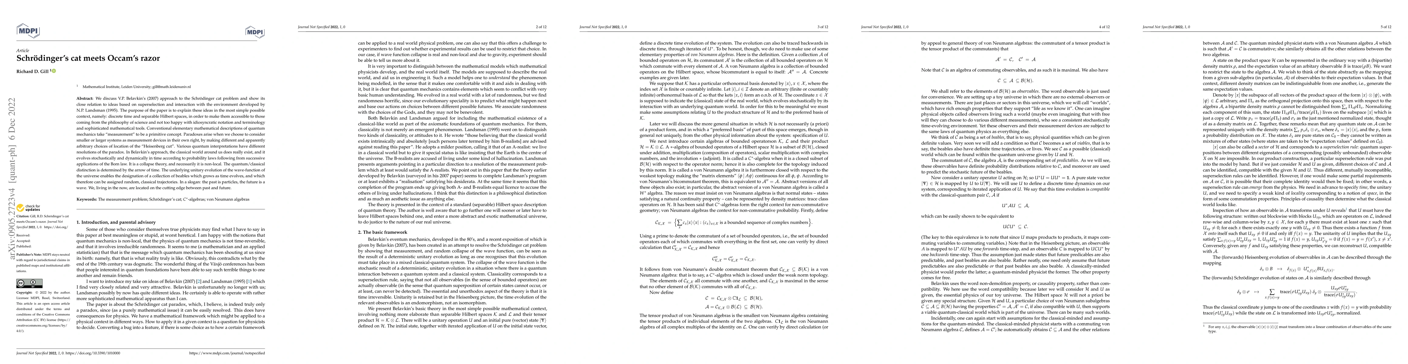 We discuss V.P. Belavkin's (2007) approach to the Schr\"odinger cat problem and show its close relation to ideas based on superselection and interaction with the environment developed by N.P. Landsman (1995). The purpose of the paper is to explain these ideas in the most simple possible context, namely: discrete time and separable Hilbert spaces, in order to make them accessible to those coming from the philosophy of science and not too happy with idiosyncratic notation and terminology and sophisticated mathematical tools. Conventional elementary mathematical descriptions of quantum mechanics take "measurement" to be a primitive concept. Paradoxes arise when we choose to consider smaller or larger systems as measurement devices in their own right, by making different and apparently arbitrary choices of location of the "Heisenberg cut". Various quantum interpretations have different resolutions of the paradox. In Belavkin's approach, the classical world around us does really exist, and it evolves stochastically and dynamically in time according to probability laws following from successive applications of the Born law. It is a collapse theory, and necessarily it is non-local. The quantum/classical distinction is determined by the arrow of time. The underlying unitary evolution of the wave-function of the universe enables the designation of a collection of beables which grows as time evolves, and which therefore can be assigned random, classical trajectories. In a slogan: the past is particles, the future is a wave. We, living in the now, are located on the cutting edge between past and future.