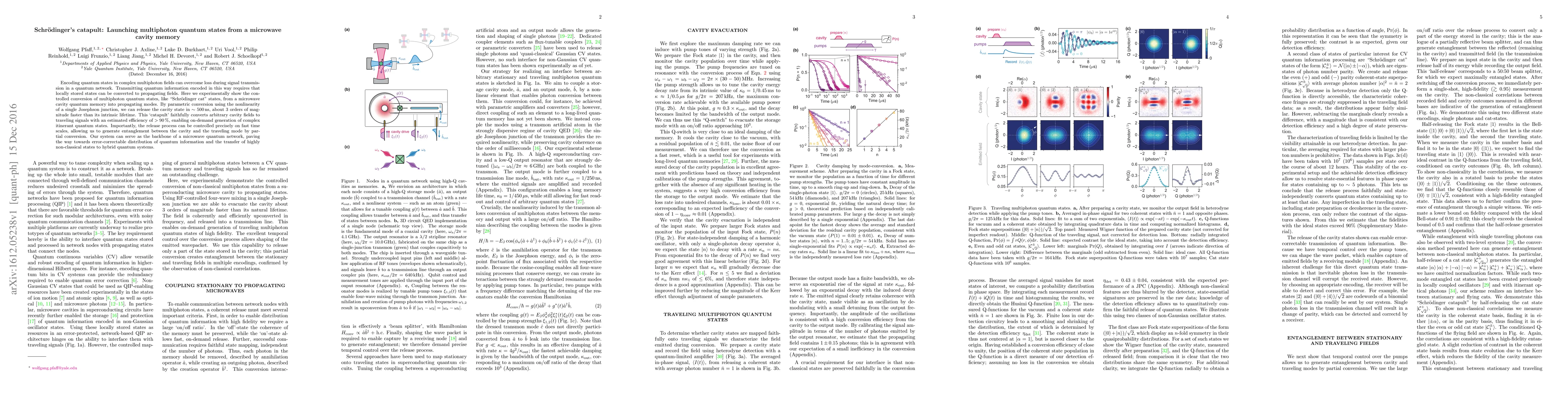This paper demonstrates the controlled conversion of multiphoton quantum states, such as "Schrödinger cat" states, from a microwave cavity memory into propagating modes using a Josephson junction. The "Schrödinger's catapult" technique releases these states in ~500 ns with high efficiency, enabling the on-demand generation of complex itinerant quantum states and potential applications in quantum networks.
