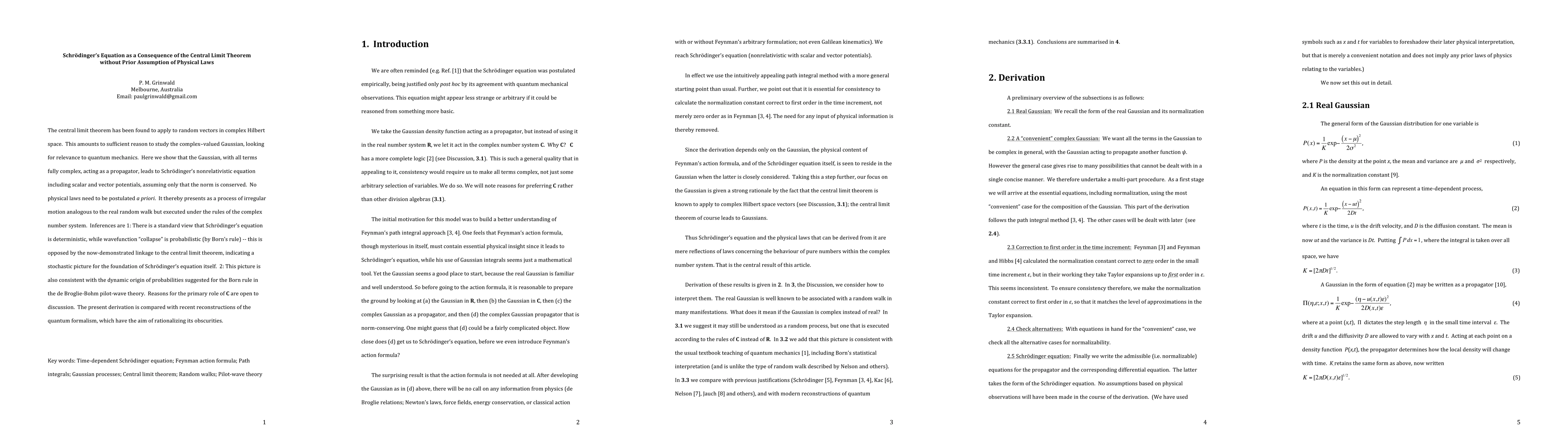 The central limit theorem has been found to apply to random vectors in complex Hilbert space. This amounts to sufficient reason to study the complex valued Gaussian, looking for relevance to quantum mechanics. Here we show that the Gaussian, with all terms fully complex, acting as a propagator, leads to Schrodinger nonrelativistic equation including scalar and vector potentials, assuming only that the norm is conserved. No prior physical laws need to be postulated. It thereby presents as a process of irregular motion analogous to the real random walk but executed under the rules of the complex number system. Inferences are 1. There is a standard view that Schrodinger equation is deterministic, while wavefunction collapse is probabilistic by Born's rule. This is opposed by the now demonstrated linkage to the central limit theorem, indicating a stochastic picture for the foundation of Schrodinger equation itself. 2. This picture is also consistent with the dynamic origin of probabilities suggested for the Born rule in the de Broglie Bohm pilot wave theory. Reasons for the primary role of C are open to discussion. The present derivation is compared with recent reconstructions of the quantum formalism, which have the aim of rationalizing its obscurities.
