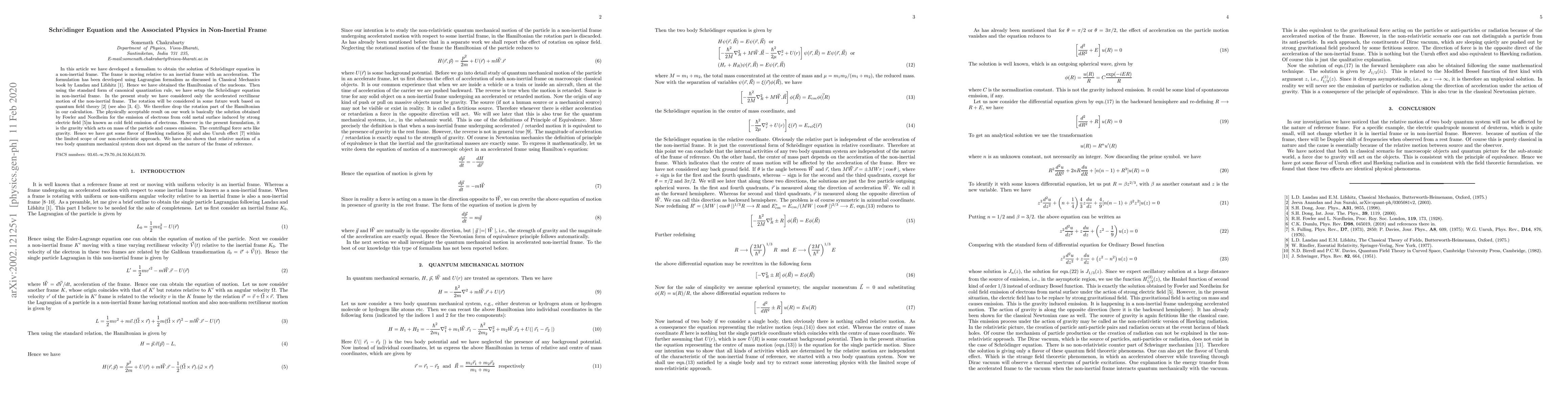 In this article we have developed a formalism to obtain the solution of Schroedinger equation in a non-inertial frame. The frame is moving relative to an inertial frame with an acceleration. The formulation has been developed using Lagrangian formalism as discussed in Classical Mechanics book by Landau and Lifshitz [1]. Hence we have obtained the Hamiltonian of the nucleons. Then using the standard form of canonical quantization rule, we have setup the Schroedinger equation in non-inertial frame. In the present study we have considered only the accelerated rectilinear motion of the non-inertial frame. The rotation will be considered in some future work based on quantum field theory [2] (see also [3, 4]). We therefore drop the rotation part of the Hamiltonian in our calculation. The physically acceptable result on our work is basically the solution obtained by Fowler and Nordheim for the emission of electrons from cold metal surface induced by strong electric field [5] known as cold field emission of electrons. However in the present formulation, it is the gravity which acts on mass of the particle and causes emission. The centrifugal force acts like gravity. Hence we have got some flavor of Hawking radiation [6] and also Unruh effect [7] within the limited scope of our non-relativistic approach. We have also shown that relative motion of a two body quantum mechanical system does not depend on the nature of the frame of reference.