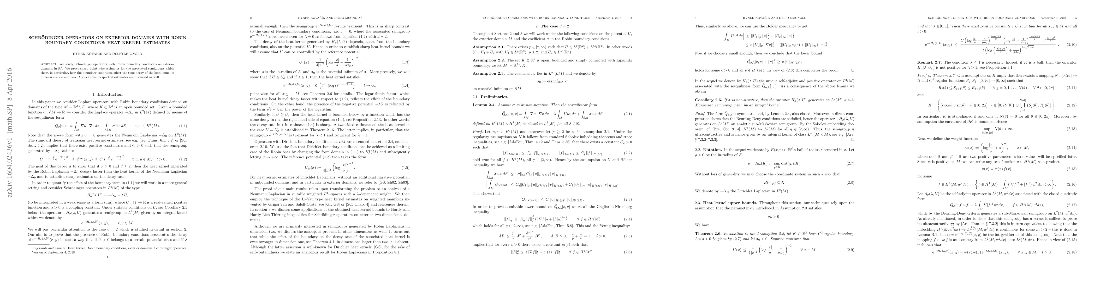 This paper investigates Schrödinger operators with Robin boundary conditions on exterior domains in $\R^d$, proving sharp point-wise estimates for the associated semi-groups and demonstrating the impact of boundary conditions on the heat kernel's time decay in dimensions one and two. Applications to spectral estimates are also explored.