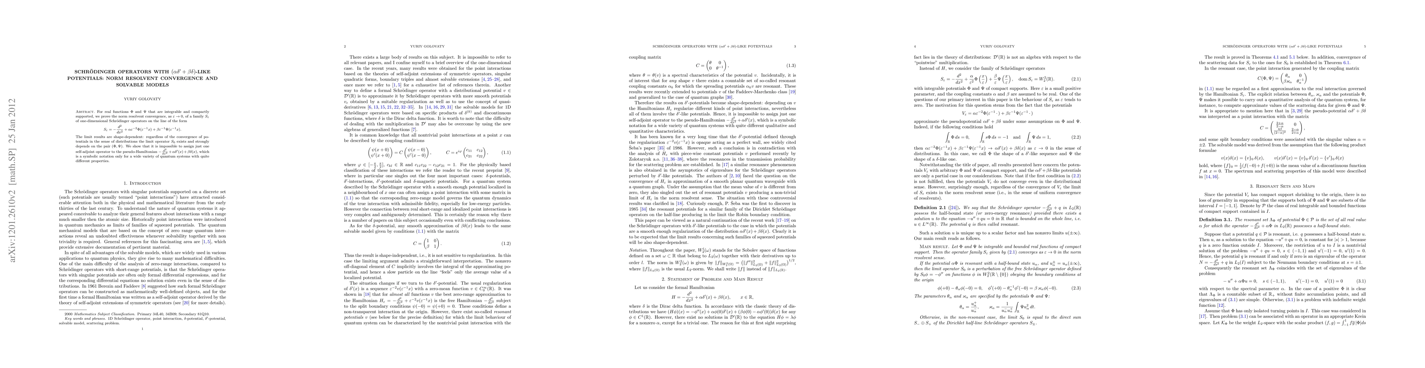 This paper proves the norm resolvent convergence of a family of one-dimensional Schrödinger operators with specific potentials as a small parameter ε approaches zero. The limit operator depends on the pair of functions Φ and Ψ, indicating diverse properties of the resulting quantum systems.