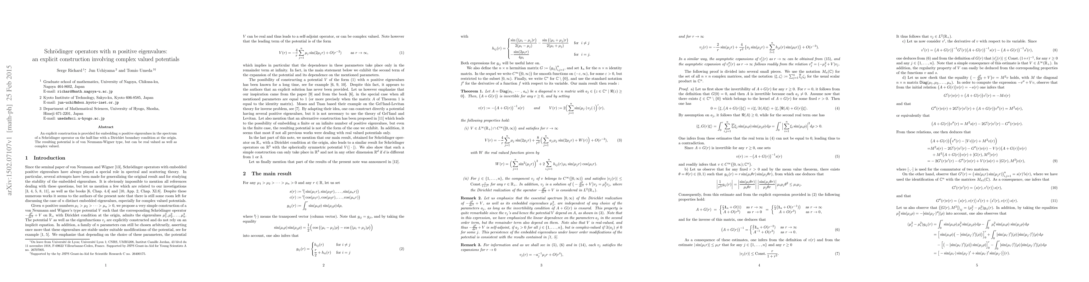 Summary: This paper presents an explicit method for constructing Schrödinger operators on the half-line with exactly n positive eigenvalues, using both real and complex valued von Neumann-Wigner type potentials under a Dirichlet boundary condition at the origin.