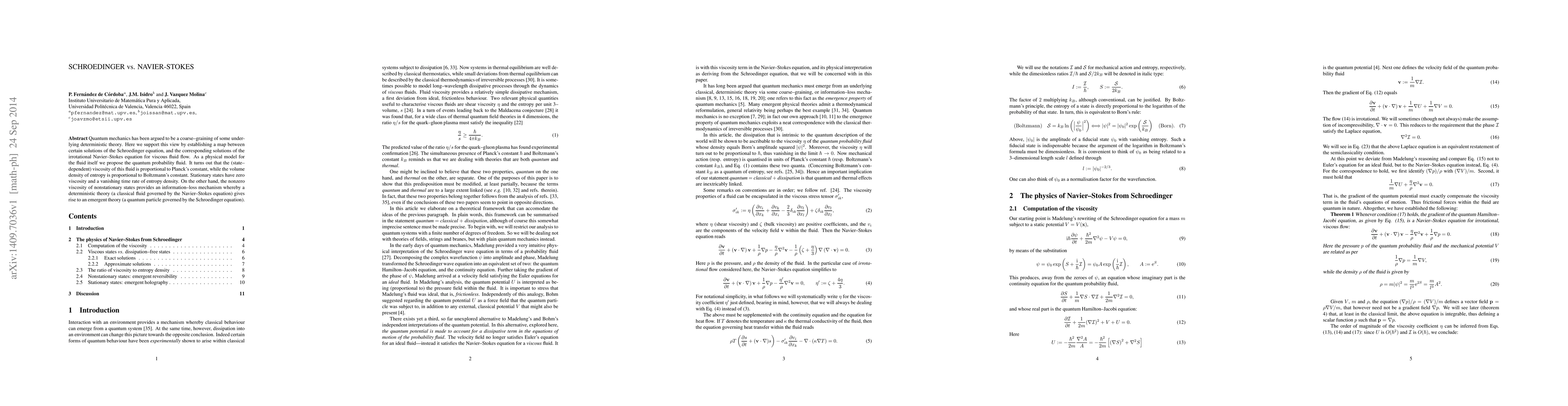 Quantum mechanics has been argued to be a coarse-graining of some underlying deterministic theory. Here we support this view by establishing a map between certain solutions of the Schroedinger equation, and the corresponding solutions of the irrotational Navier-Stokes equation for viscous fluid flow. As a physical model for the fluid itself we propose the quantum probability fluid. It turns out that the (state-dependent) viscosity of this fluid is proportional to Planck's constant, while the volume density of entropy is proportional to Boltzmann's constant. Stationary states have zero viscosity and a vanishing time rate of entropy density. On the other hand, the nonzero viscosity of nonstationary states provides an information-loss mechanism whereby a deterministic theory (a classical fluid governed by the Navier-Stokes equation) gives rise to an emergent theory (a quantum particle governed by the Schroedinger equation).