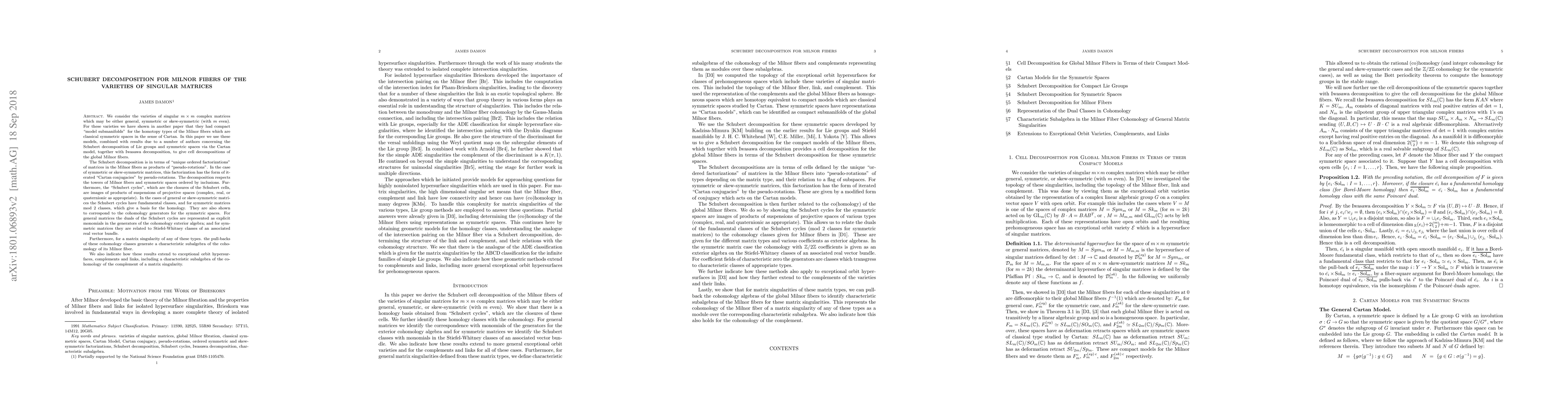 We consider the varieties of singular $m \times m$ complex matrices which may be either general, symmetric or skew-symmetric (with $m$ even). For these varieties we have shown in another paper that they had compact "model submanifolds", for the homotopy types of the Milnor fibers which are classical symmetric spaces in the sense of Cartan. In this paper we use these models, combined with results due to a number of authors concerning the Schubert decomposition of Lie groups, symmetric spaces via the Cartan model together with Iwasawa decomposition to give a cell decomposition of the global Milnor fibers. The Schubert decomposition is in terms of "unique ordered factorizations" of matrices in the Milnor fibers as products of " pseudo-rotations". In the case of symmetric or skew-symmetric matrices, this factorization has the form of iterated "Cartan conjugacies" by pseudo-rotations. The "Schubert cycles" (the closures of the Schubert cells), are images of products of suspensions of projective spaces (complex, real, or quaternionic). For general or skew-symmetric matrices the Schubert cycles have fundamental classes, and for symmetric matrices $\mod 2$ classes, giving a basis for the homology, corresponding to the cohomology generators for the symmetric spaces. For general matrices the duals of the Schubert cycles are given as explicit monomials in the generators of the exterior cohomology algebra; and for symmetric matrices they are related to Stiefel-Whitney classes of an associated vector bundle. Furthermore, for any matrix singularity of these types the pull-backs of these cohomolgy classes generate a characteristic subalgebra of the cohomology of the Milnor fiber. These results extend to exceptional orbit hypersurfaces, complements and links.