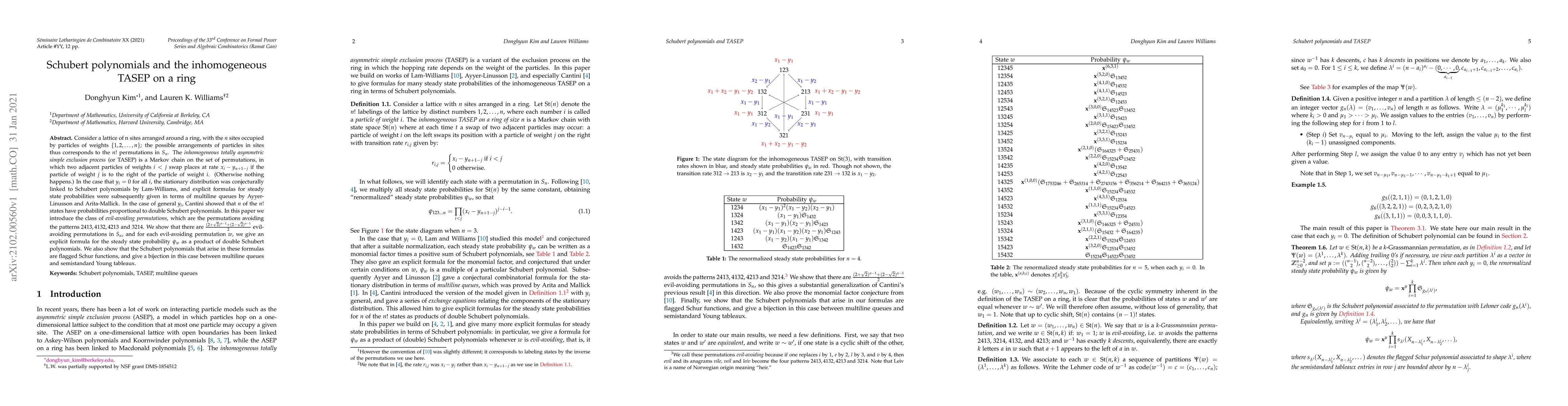 This paper explores the connection between Schubert polynomials and the inhomogeneous totally asymmetric simple exclusion process (TASEP) on a ring, showing that the steady state probabilities for certain permutations correspond to double Schubert polynomials. It introduces evil-avoiding permutations and provides an explicit formula for their probabilities in terms of these polynomials, establishing a bijection between multiline queues and semistandard Young tableaux.