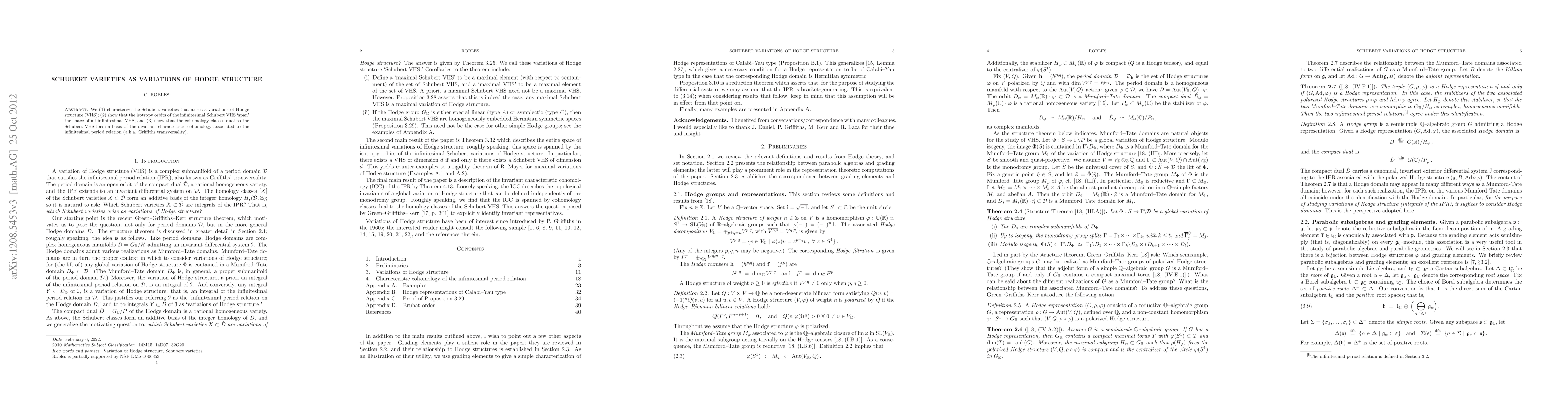 We (1) characterize the Schubert varieties that arise as variations of Hodge structure (VHS); (2) show that the isotropy orbits of the infinitesimal Schubert VHS `span' the space of all infinitesimal VHS; and (3) show that the cohomology classes dual the Schubert VHS form a basis of the invariant characteristic cohomology associated to the infinitesimal period relation (a.k.a. Griffiths transversality).