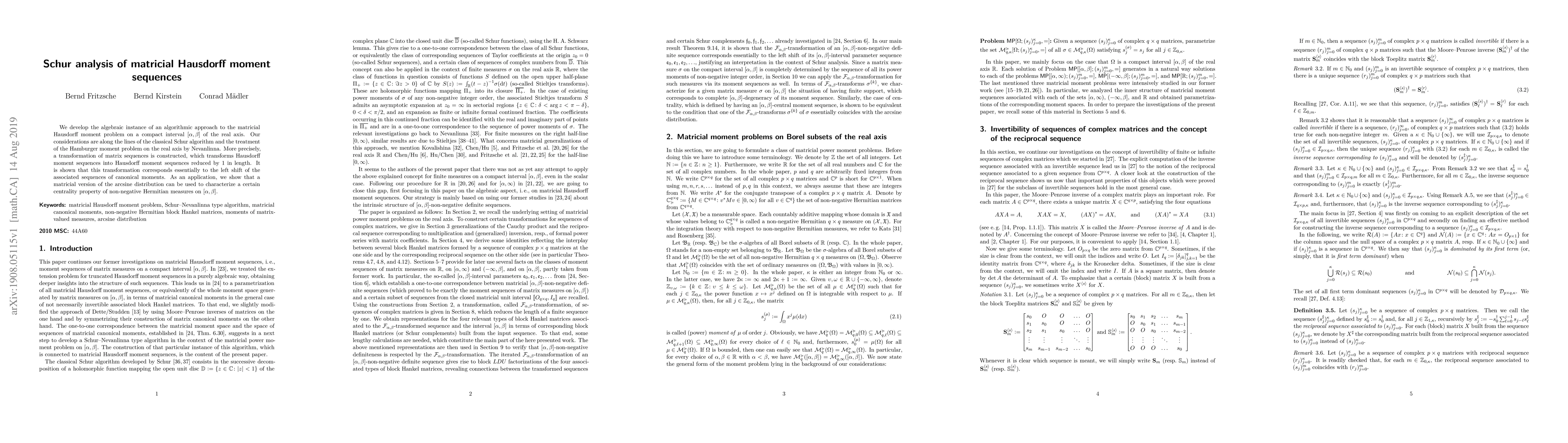This paper develops an algorithmic approach to solving the matricial Hausdorff moment problem using Schur analysis, transforming matrix sequences via a left shift, and applying it to characterize centrality properties of non-negative Hermitian measures on a compact interval.