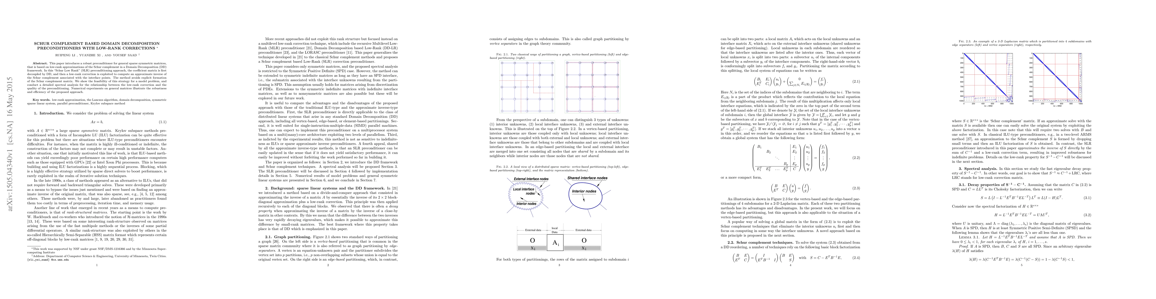 This paper proposes a "Schur Low Rank" (SLR) preconditioner for sparse symmetric matrices, leveraging low-rank approximations of the Schur complement within a Domain Decomposition framework to enhance robustness and efficiency without explicitly forming the Schur complement matrix. Numerical experiments demonstrate the method's effectiveness.