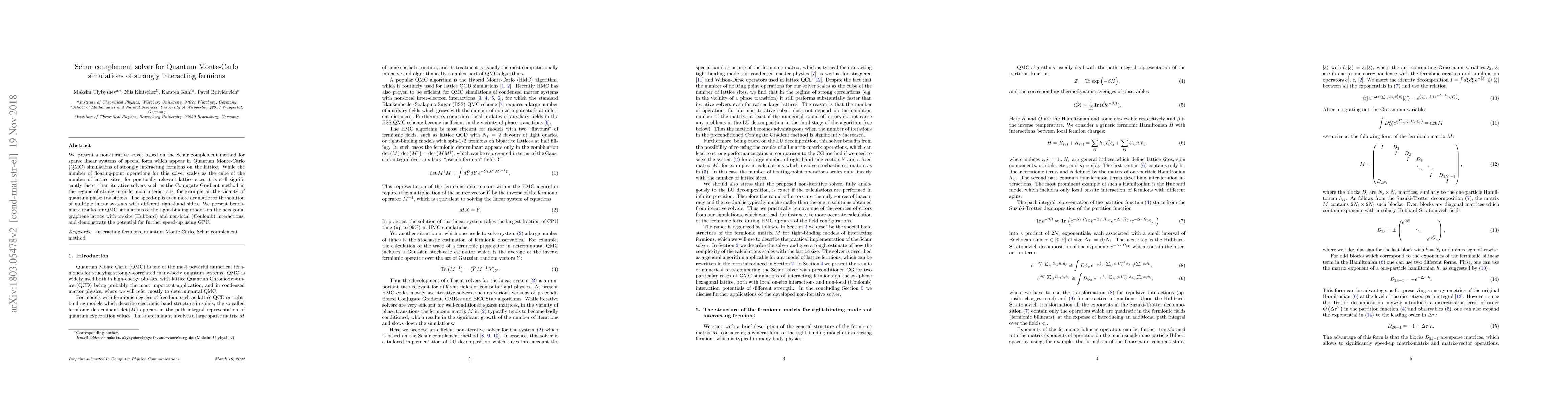 This paper introduces a non-iterative Schur complement solver for sparse linear systems in Quantum Monte-Carlo simulations of strongly interacting fermions, showing significant speed-up over iterative methods like Conjugate Gradient, especially near quantum phase transitions. Benchmark results on graphene lattice models demonstrate the solver's efficiency and potential for further acceleration using GPUs.