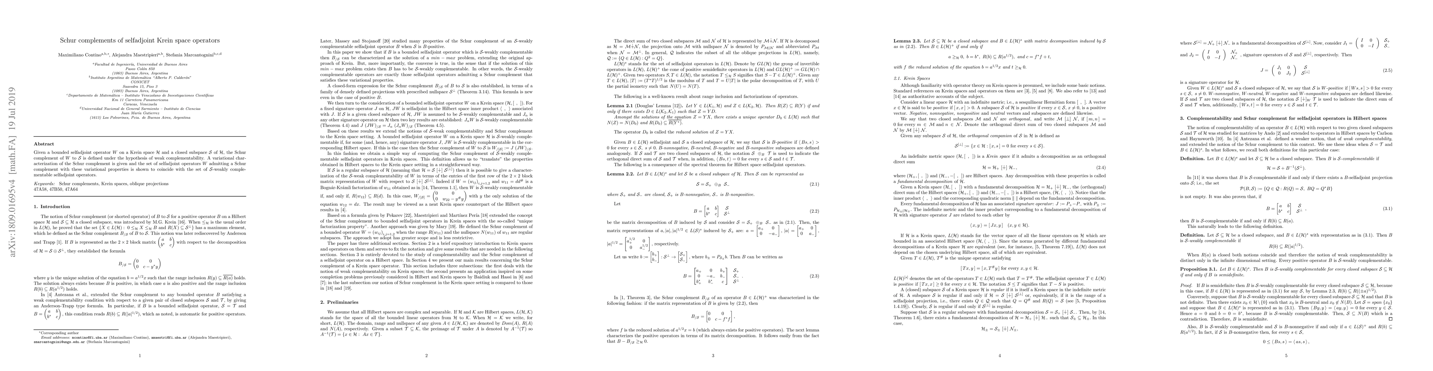 Given a bounded selfadjoint operator W on a Krein space H and a closed subspace S of H, the Schur complement of W to S is defined under the hypothesis of weak complementability. A variational characterization of the Schur complement is given and the set of selfadjoint operators W admitting a Schur complement with these variational properties is shown to coincide with the set of S-weakly complementable selfadjoint operators.