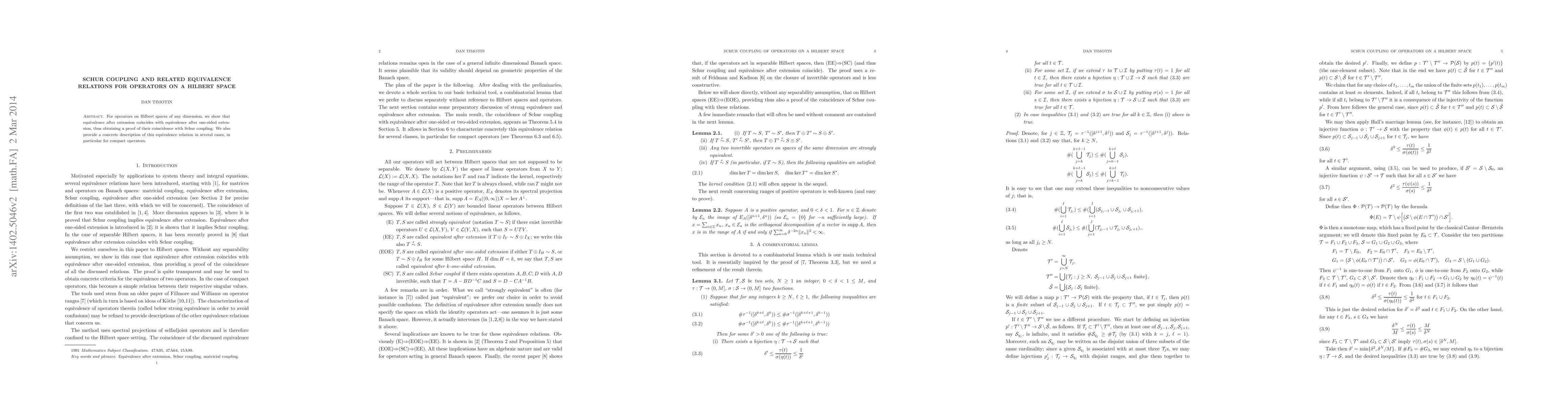 Summary: The paper establishes that equivalence of operators on Hilbert spaces holds consistently under extension and Schur coupling, particularly for compact operators, providing a detailed description of these equivalence relations.